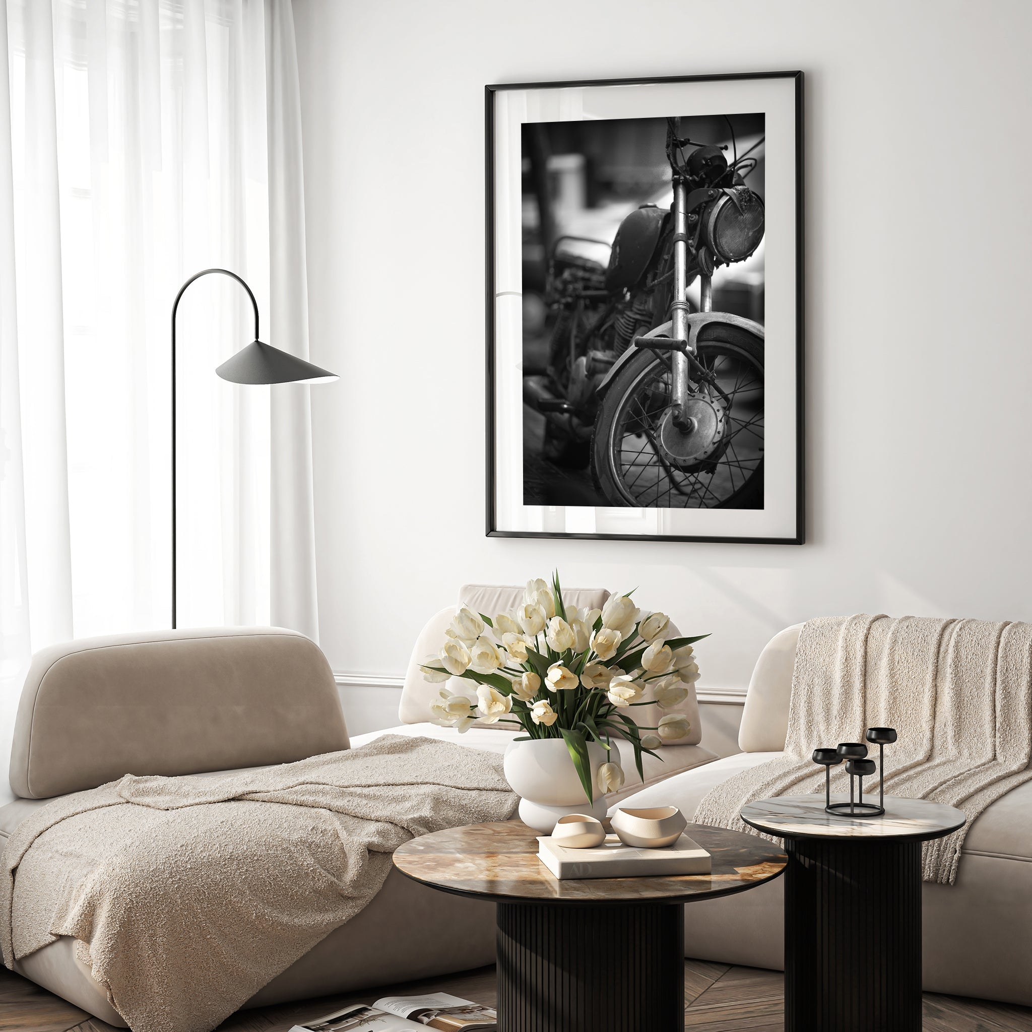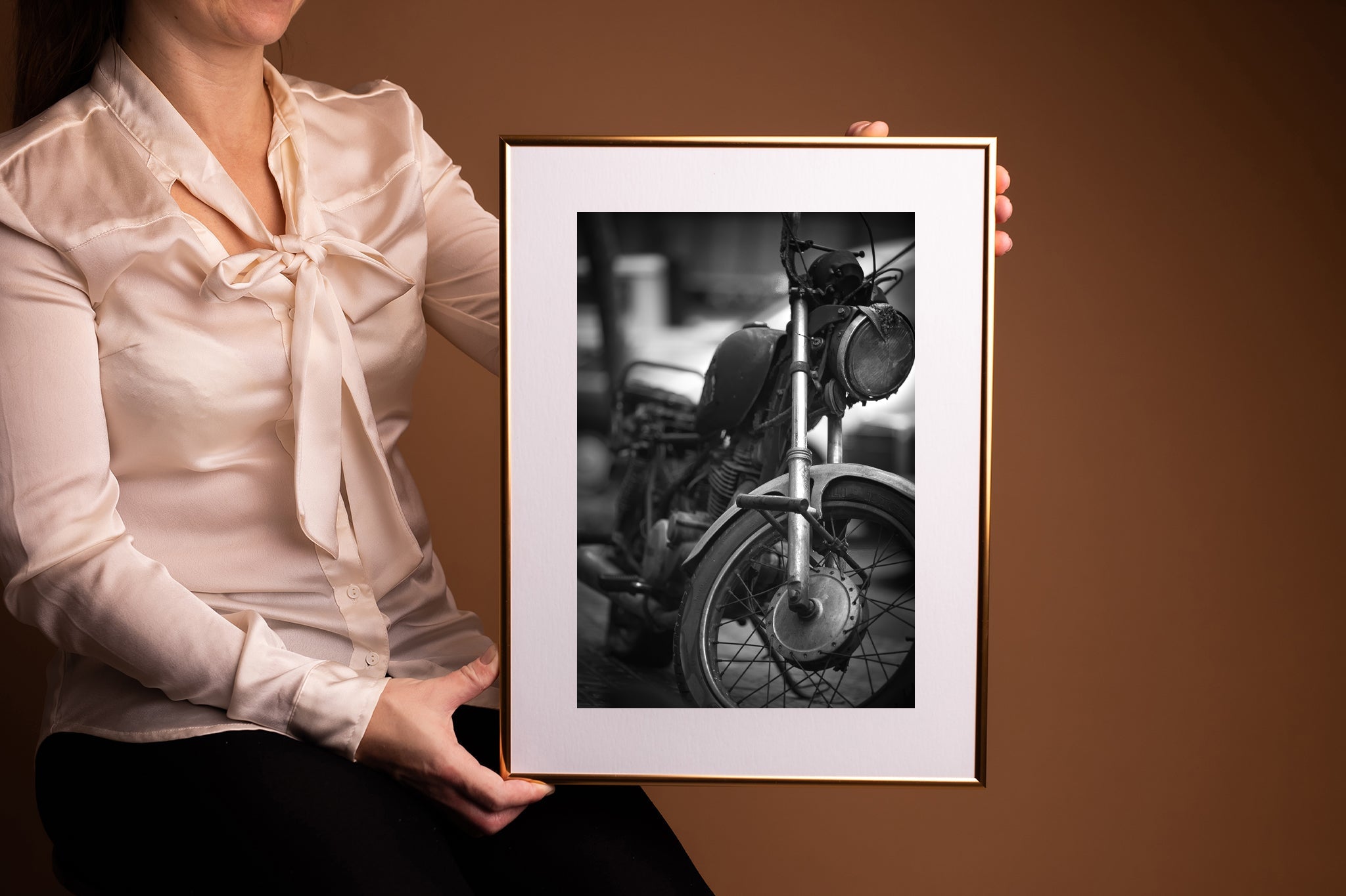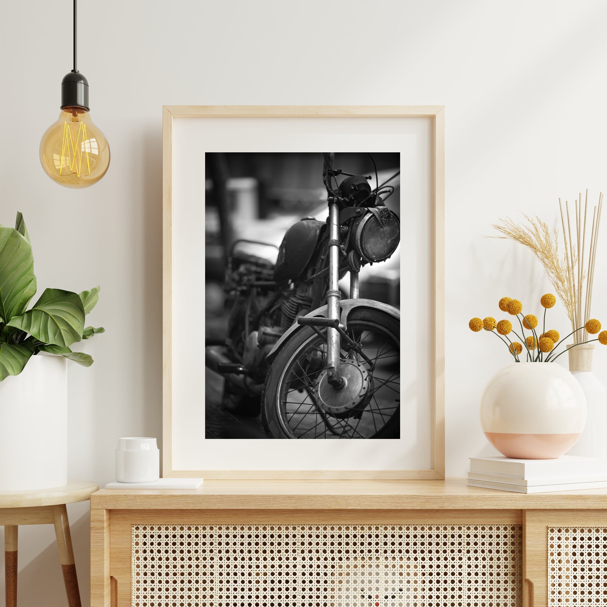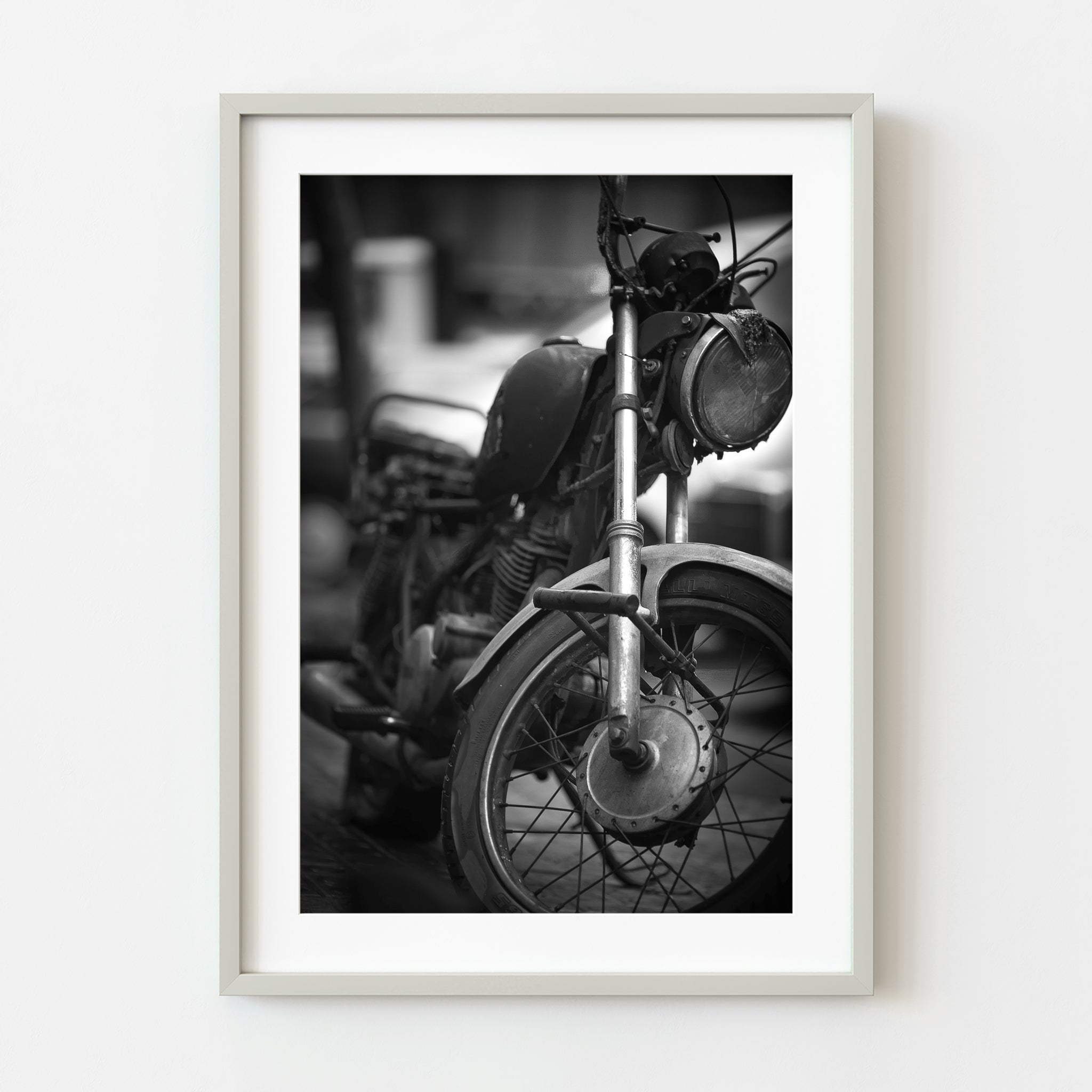This image lives in the intersection of abandoned and alive. The bike should have been scrapped. Instead, it’s parked and chained—against the backdrop of a living city. It belongs to someone; it has a story—but I only captured the moment when it paused, rigid and real. That’s what this photo offers to your wall: form, texture, and a story you don’t need to tell.