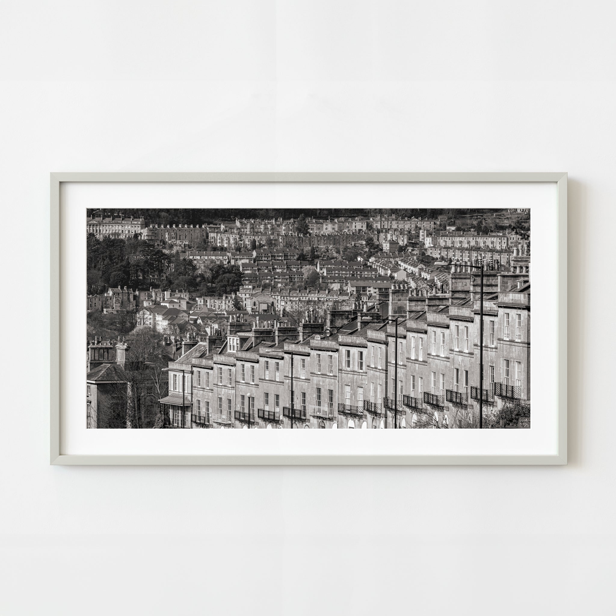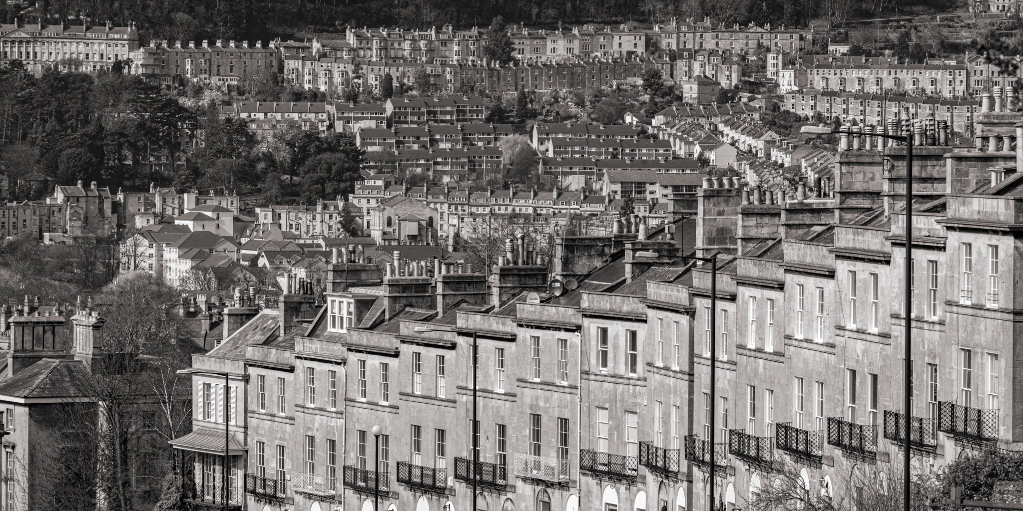 What pulled me in here was the density of it all. Bath isn’t loud or chaotic, but visually it’s full—layer after layer of rooftops rising the hill. Shooting it in black and white made the textures stand out even more. Without colour, the city’s patterns become stronger: the stone blocks, the iron balconies, the tidy windows, each terrace stepping its way into the distance. I wanted the photograph to feel like you’re tracing the landscape with your eyes, noticing small details you might miss at street level.