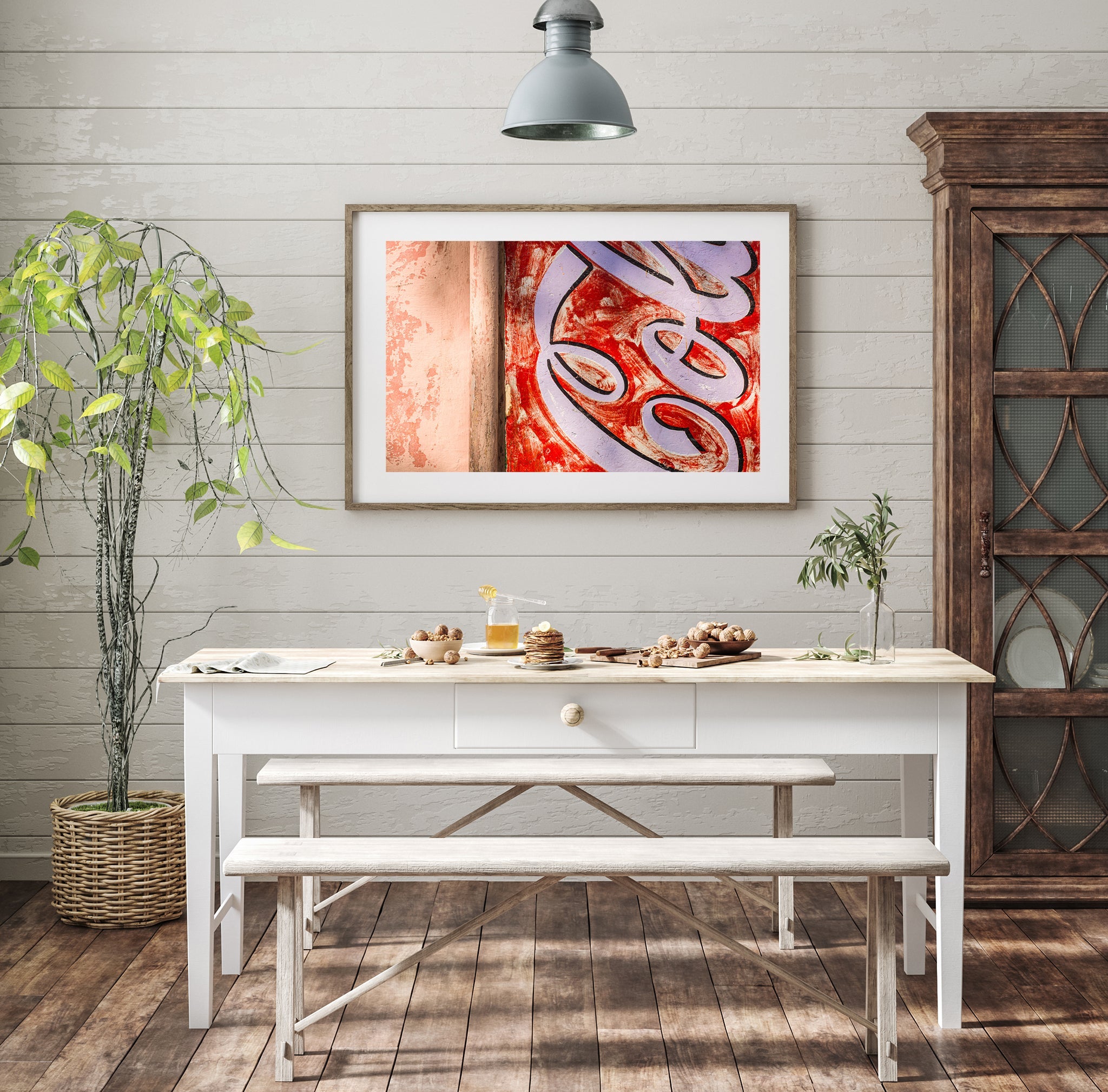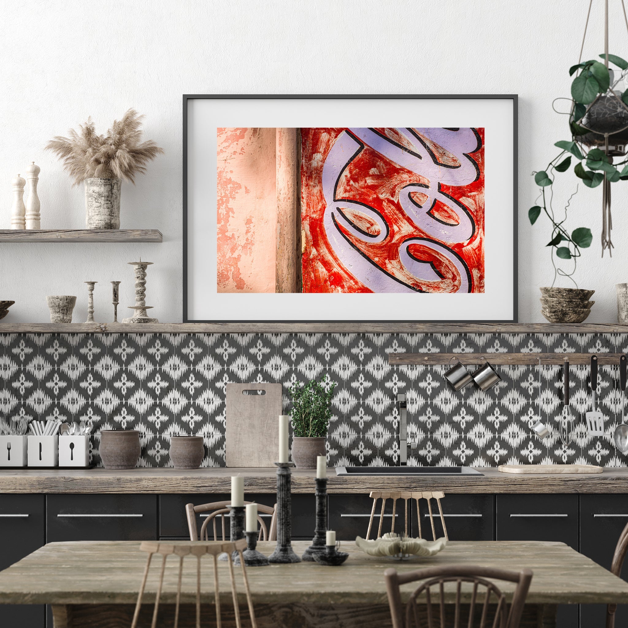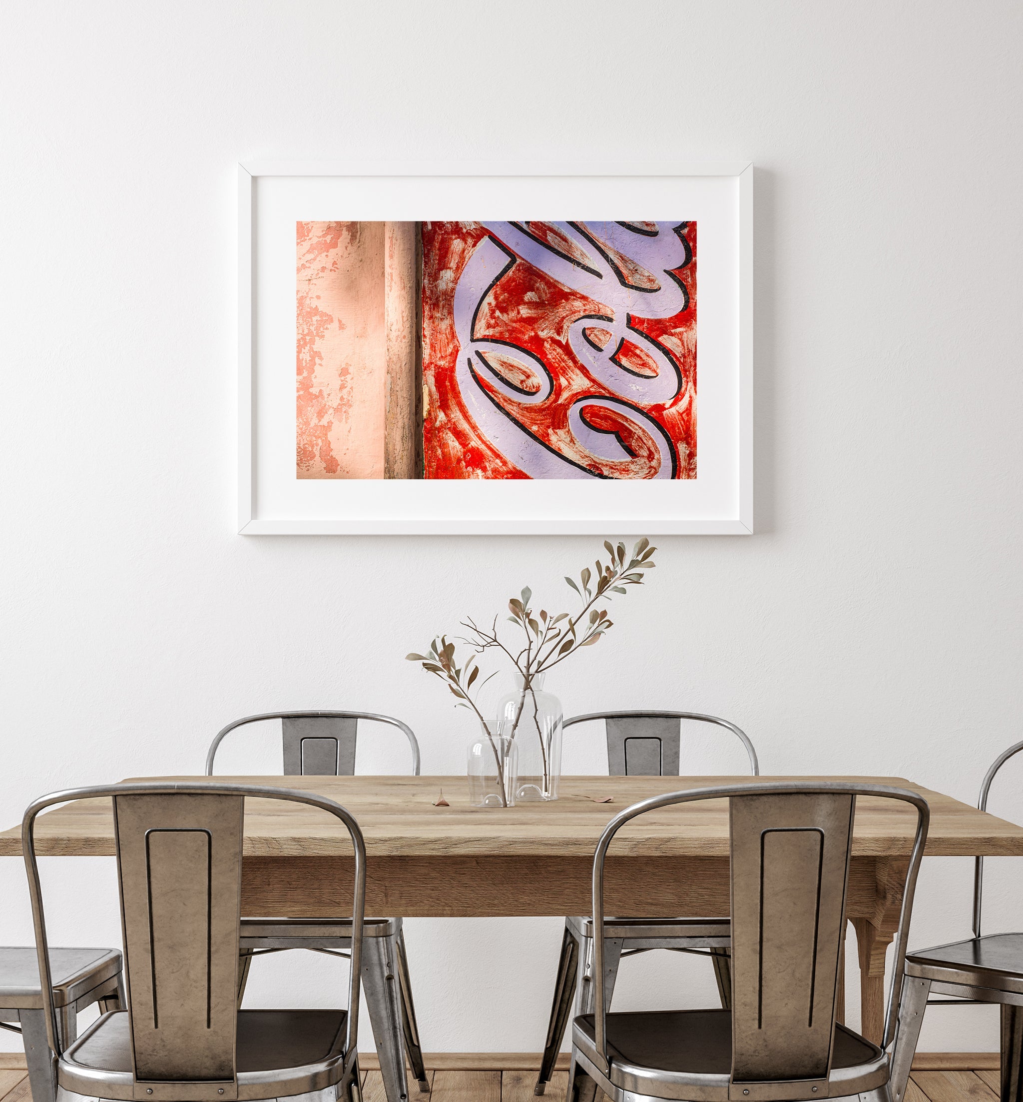 I kept the framing tight. No distractions. Just the washed-out colour, the cracked plaster, the typography barely holding shape. What was once bright and commercial is now abstract—half-erased language turned into a slow-burning story. That’s what drew me in. And it’s why this scene now lives on, printed with intention instead of buried under another coat of paint.
