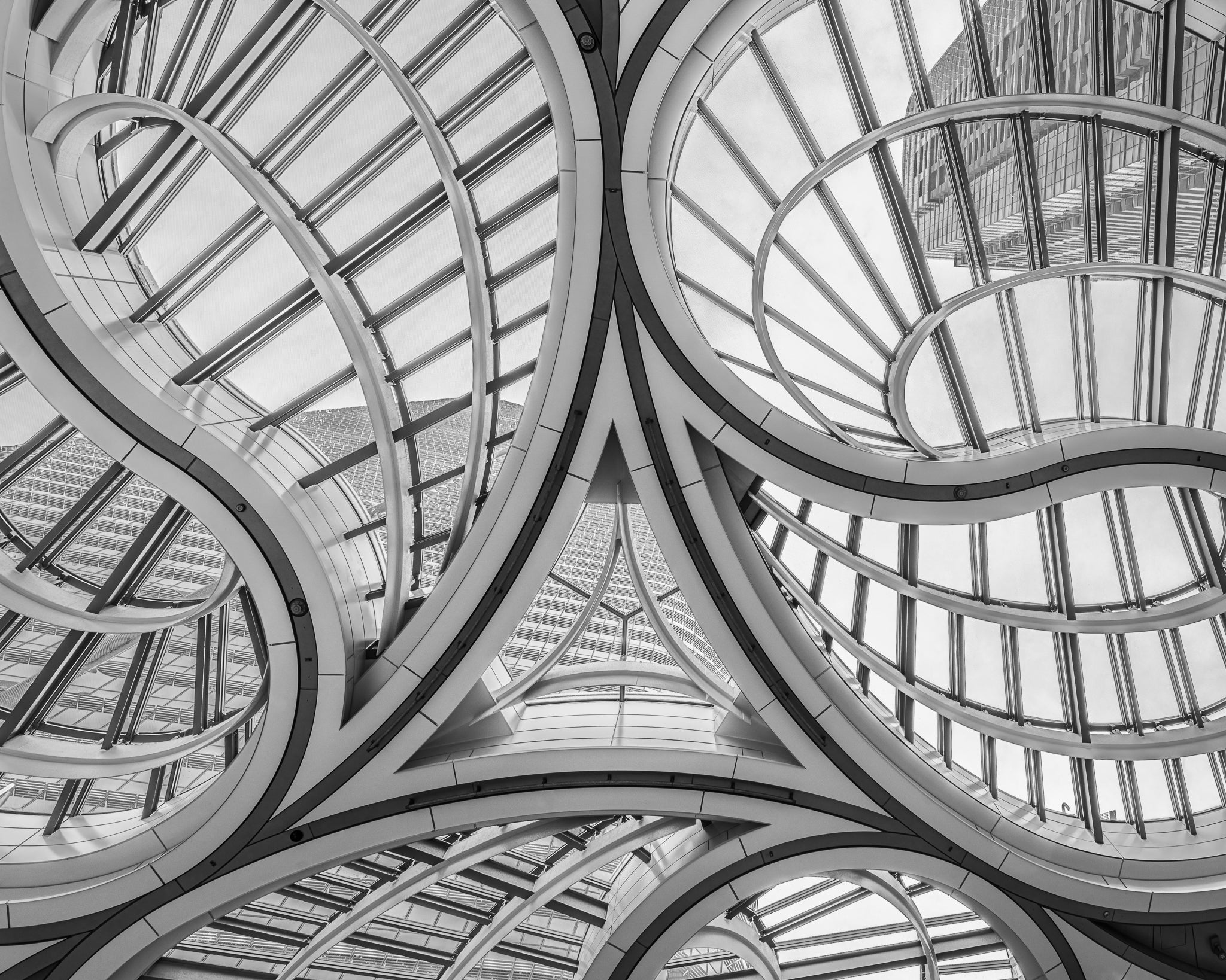 The overhead design is composed of interlocking rings and sweeping curves that play off one another. Every line is deliberate, every angle confident. Shooting it in black and white felt right—it strips away distraction and lets the shapes speak for themselves. In monochrome, the metal framework becomes more assertive, more architectural. The contrast between bright sky and dark structural beams pulls you deeper into the rhythm of the design.