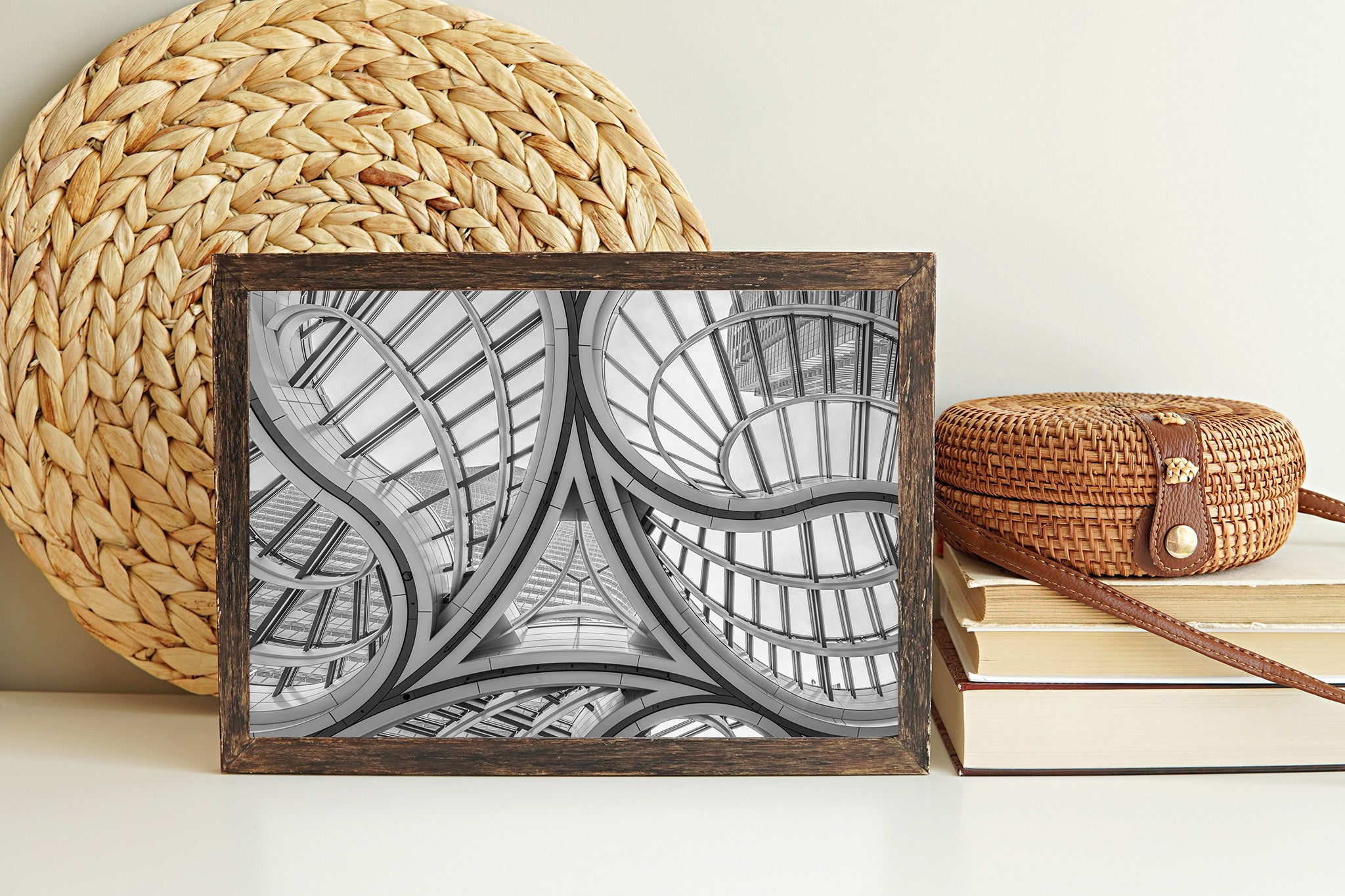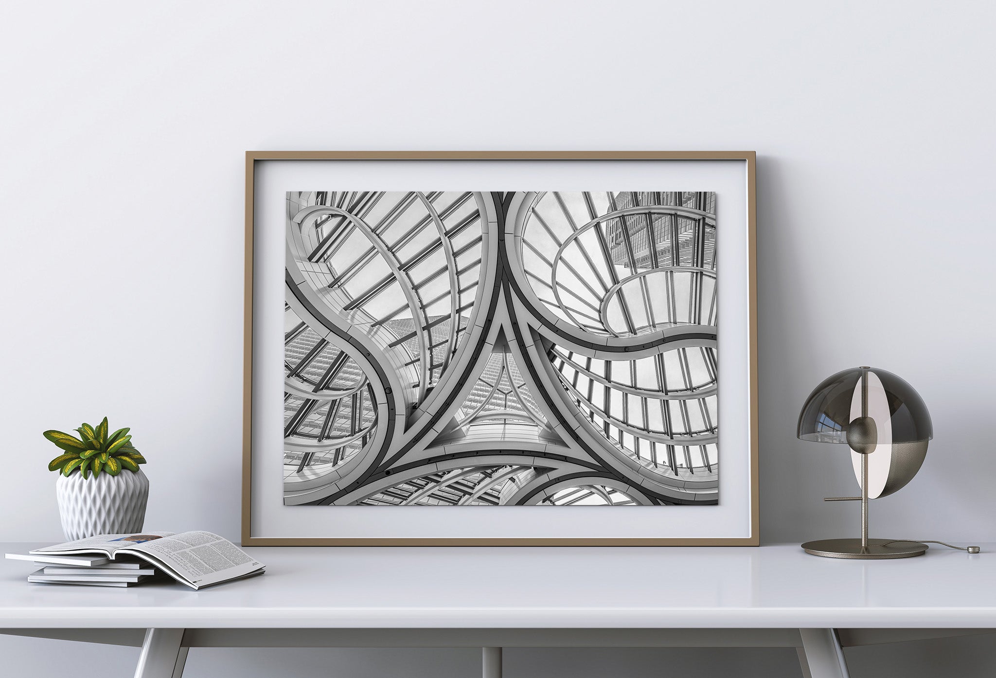 From a collector’s perspective, this piece leans into modernism without feeling cold. The repetition of circular forms adds a steady calm, while the intersecting lines keep your eyes moving across the frame. It works well in contemporary spaces, offices, and rooms where clean design and quiet energy matter. The details are crisp enough that you can stand close and find new patterns each time, yet the overall structure holds together beautifully from a distance.