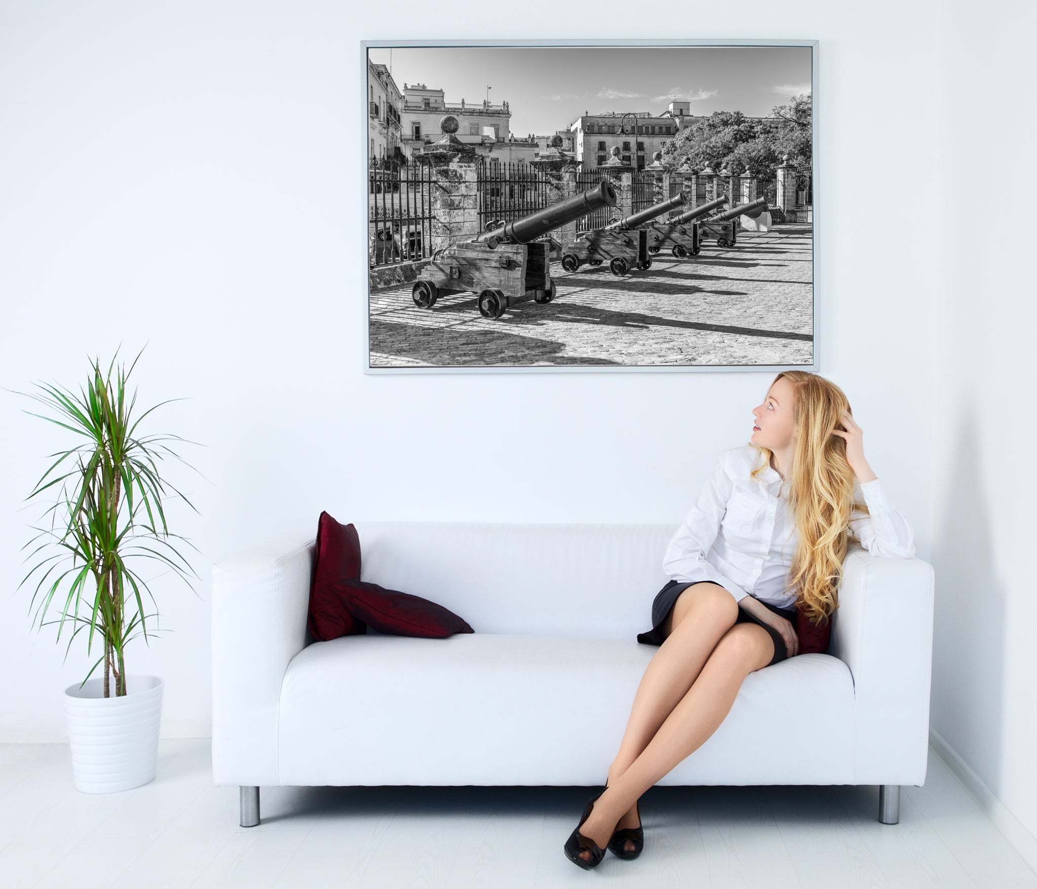 What grabbed me first was the geometry: the repetition, the rhythm, the way history and form lock into place with almost military precision. The cannons are not replicas—they’re relics, survivors of centuries, now mute but still commanding. Set on rugged wooden carriages, their weathered surfaces show the weight of their years. Behind them, the classic stone columns and wrought iron fencing wrap the scene in that unmistakable Havana blend of strength and ornate character.