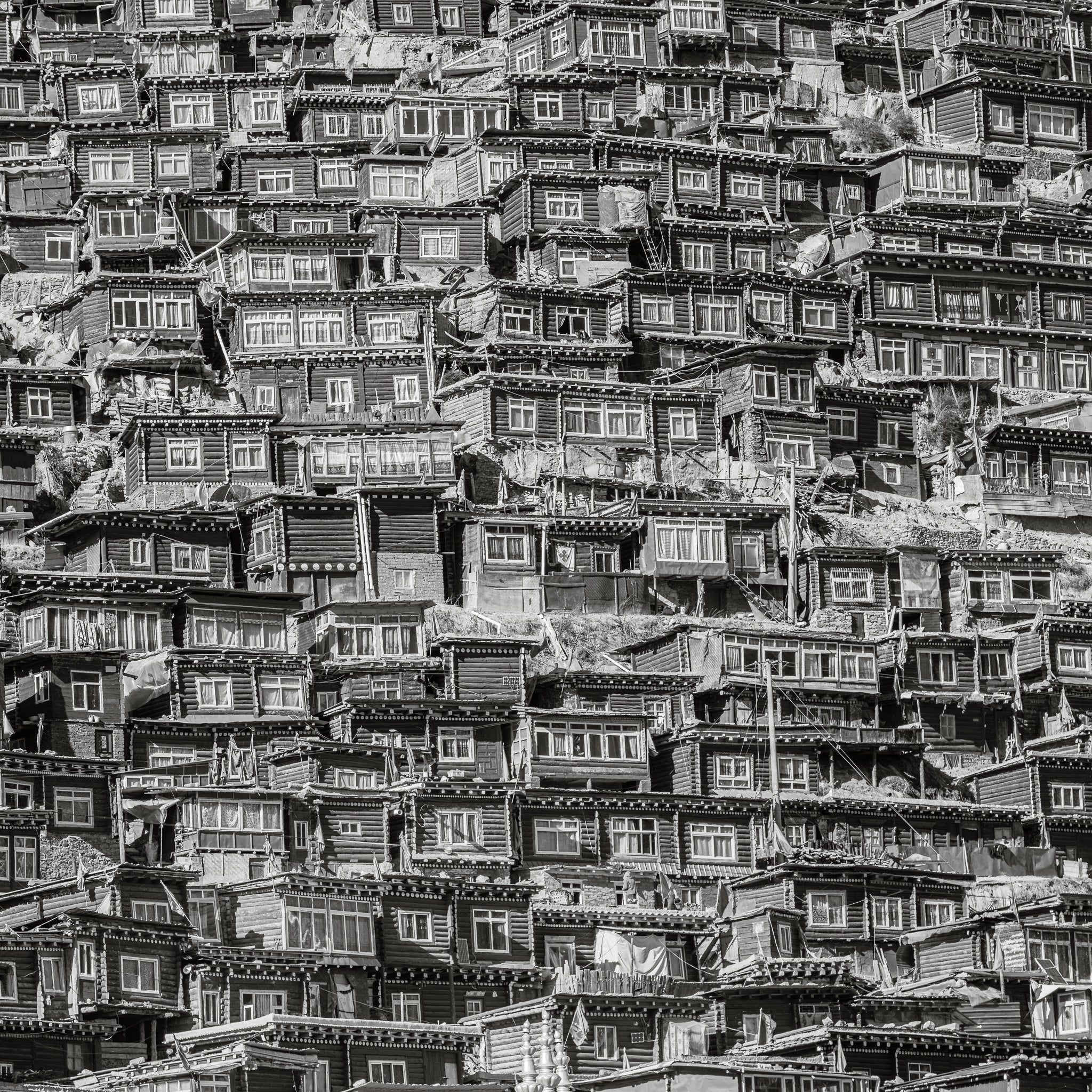 When I first laid eyes on the Larung Gar Buddhist settlement in China, it felt like stepping into a living tapestry. An entire hillside transformed into a maze of tightly stacked homes, each one built with a kind of raw determination. Seeing it in black and white strips away distraction—it leaves only form, shadow, and the sheer density of human resilience. Every line of woodwork, every window frame, every slanted rooftop whispers about lives lived close together, bound by faith and community.