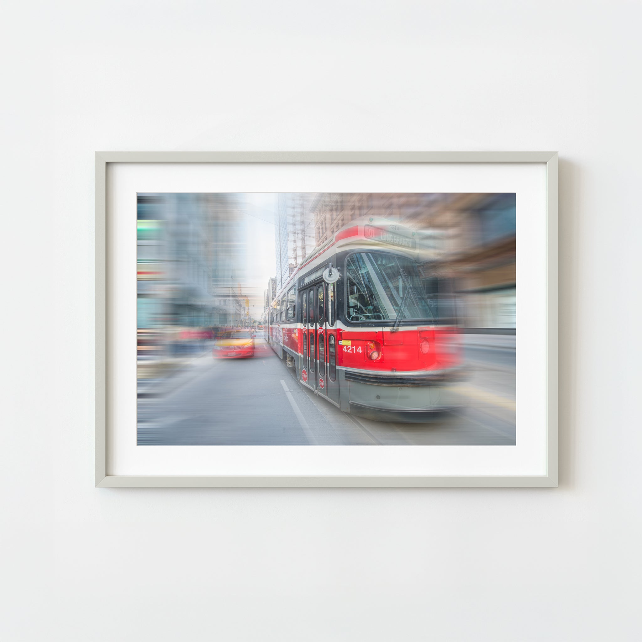 This piece brings a lively presence to a room. It has motion and mood, but it’s also grounded. I’ve seen this image work incredibly well in spaces where a touch of urban personality can transform the atmosphere — modern living rooms, workspaces, studios, or any area where life and conversation take place. The red of the streetcar instantly draws the eye, while the surrounding blur lends the piece a softness and openness that allows the room to breathe. It’s bold and calm at the same time — a balance that feels a lot like Toronto itself.