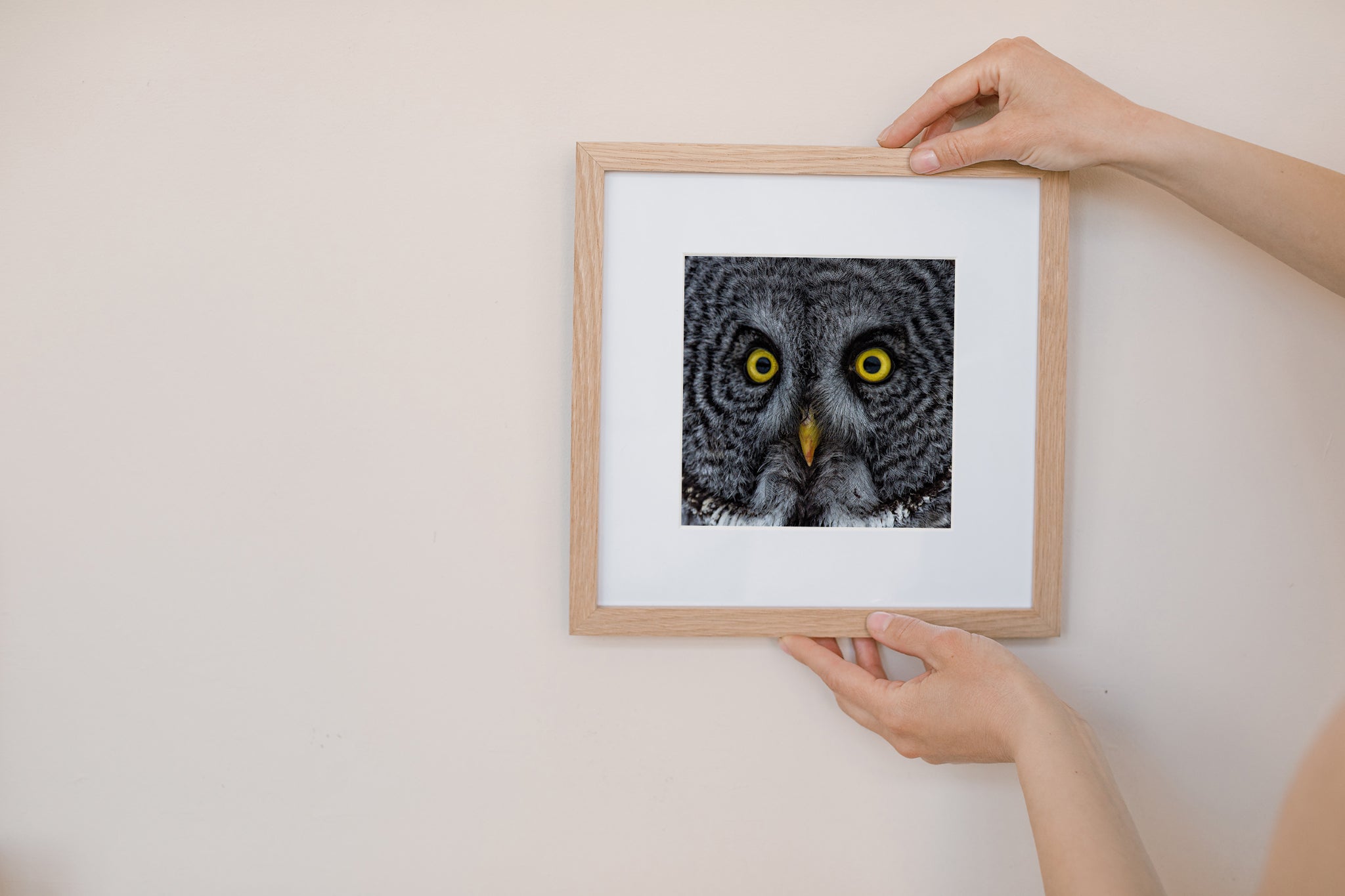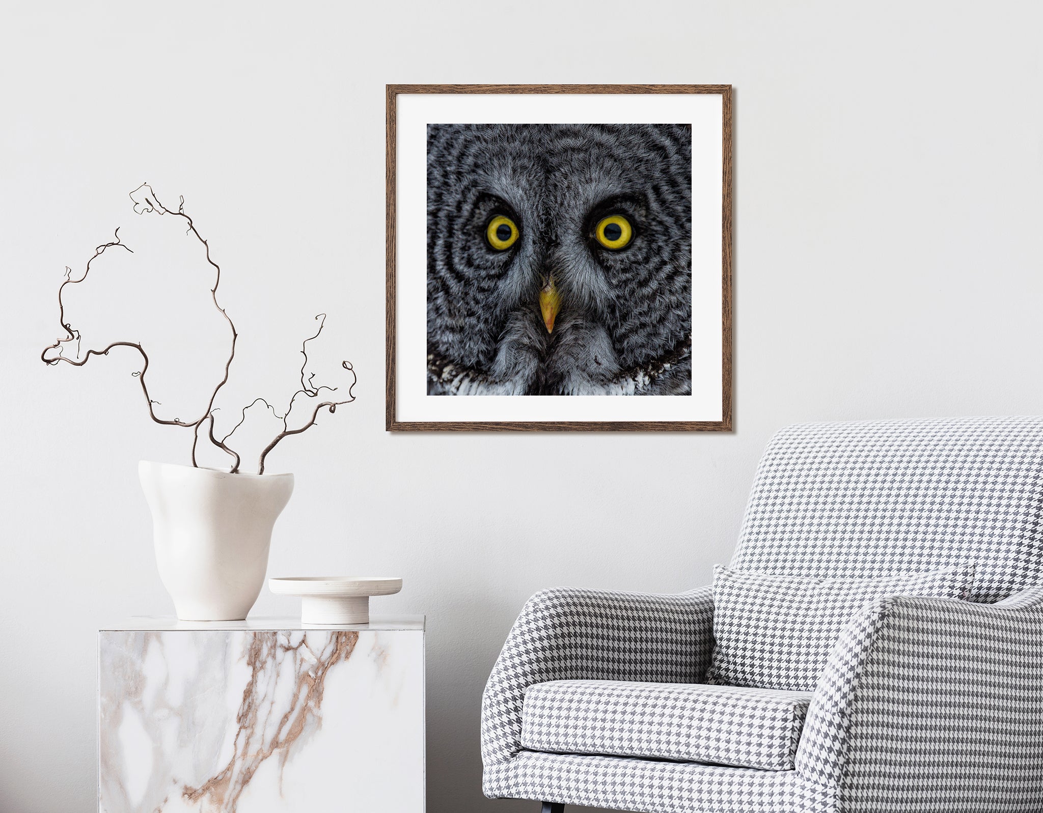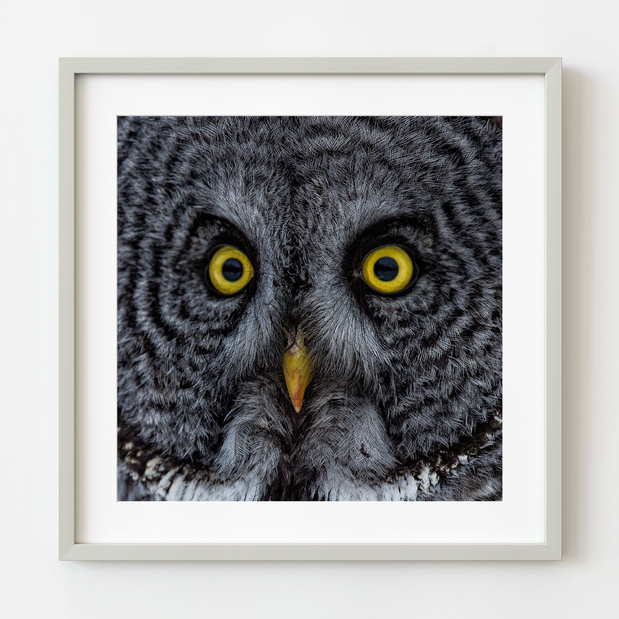 No planteas un búho. Esperas y respetas el momento. Este marco llegó después de una larga quietud, y solo duró segundos. ¿Pero esa mirada? Se mantiene. Incluso en forma impresa, lo sentirás en la habitación.