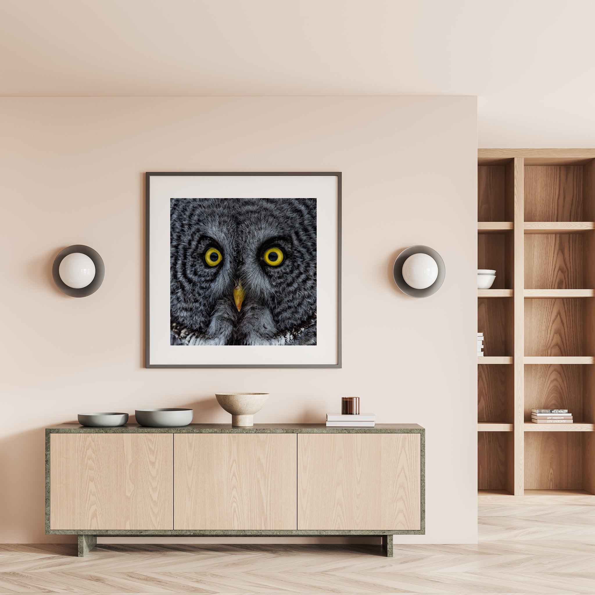 Este es el tipo de Arte de pared Eso pertenece a un espacio destinado a pausa. No llena un vacío, crea presencia. Un pasillo, un estudio, un rincón tranquilo donde la habitación respira más lentamente. El búho no grita. Ve.