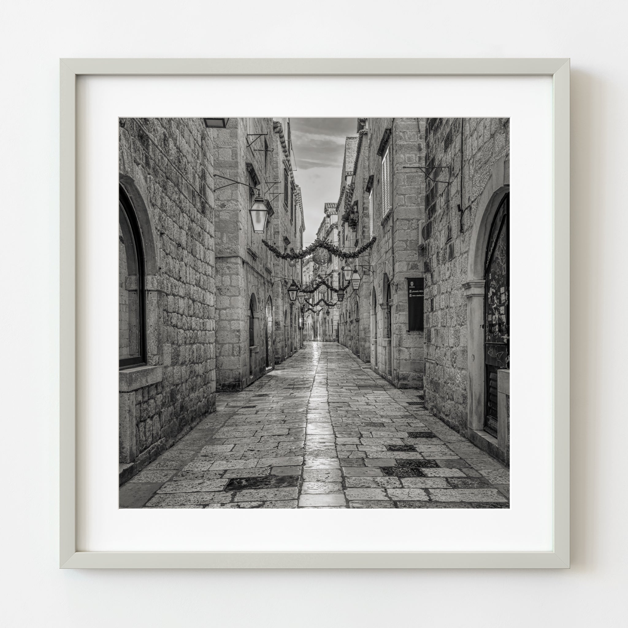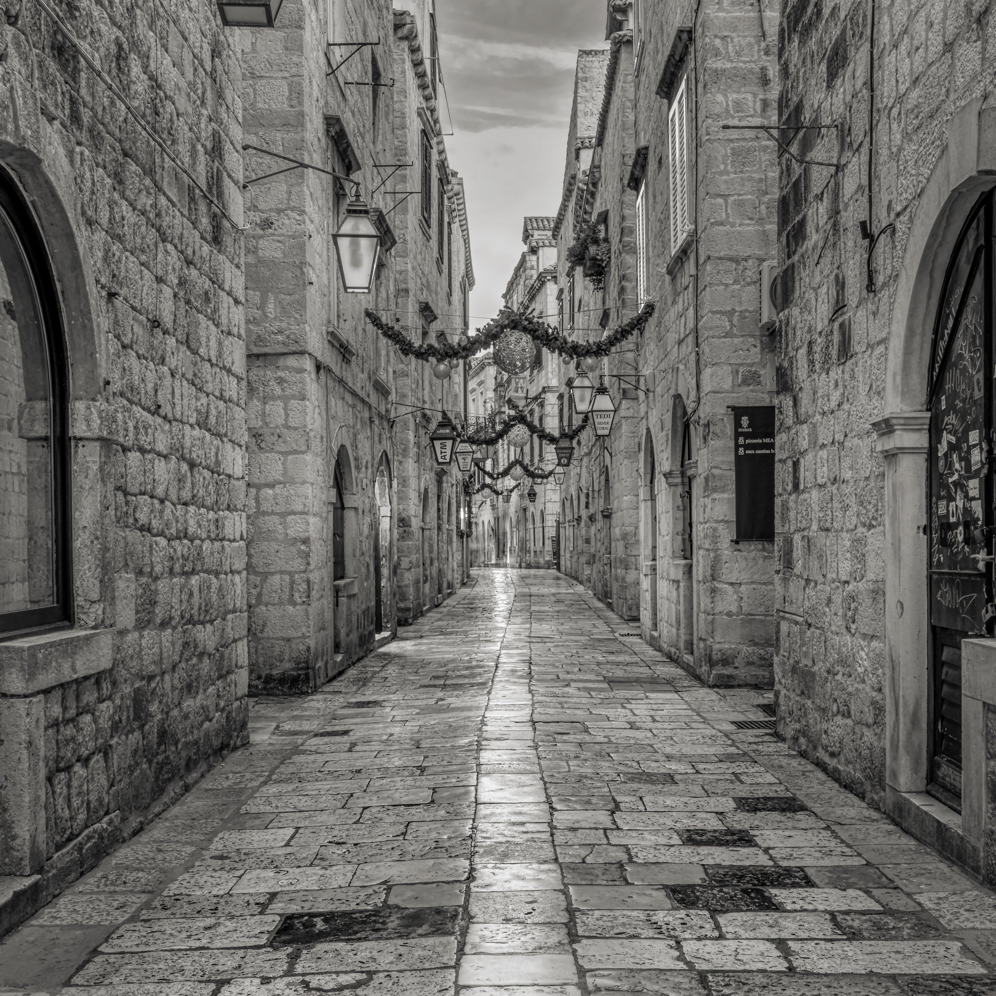 Cette image capture ce moment rare - une rue déserte au cœur de la vieille ville de Dubrovnik, ses blocs de calcaire polis à une douce brillance après des années de pas, de pluie et de soleil. Les guirlandes suspendues entre les bâtiments indiquent que la saison vient de passer, mais l'ambiance ici est plus que festive; C'est contemplatif. Le noir et blanc fait ressortir le caractère de la pierre, la texture usée de la passerelle et la géométrie des lanternes et des arches qui définissent ce paysage urbain médiéval.