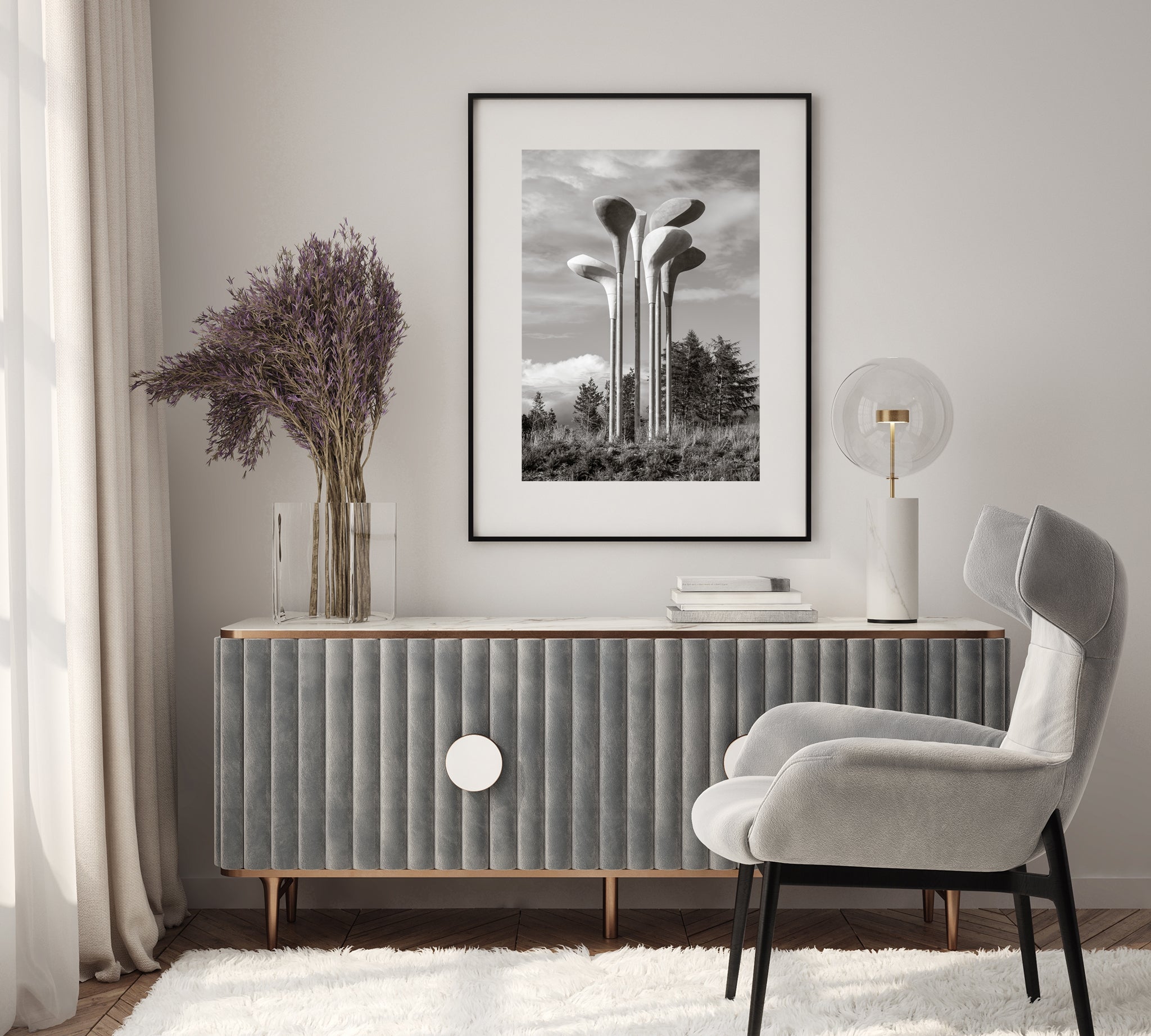 흑백으로 렌더링 된이 프린트는 산만 함을 제거하고 지오메트리와 질감이 스스로 말할 수 있습니다. 풍화 된 땅과 조각의 부드럽고 유용한 선이 영속의 개념, 즉 인공, 다른 원소의 개념과 함께 연주됩니다. 두 번 보도록 요청하는 이미지입니다. 먼저 형태로, 그 아이디어에서.