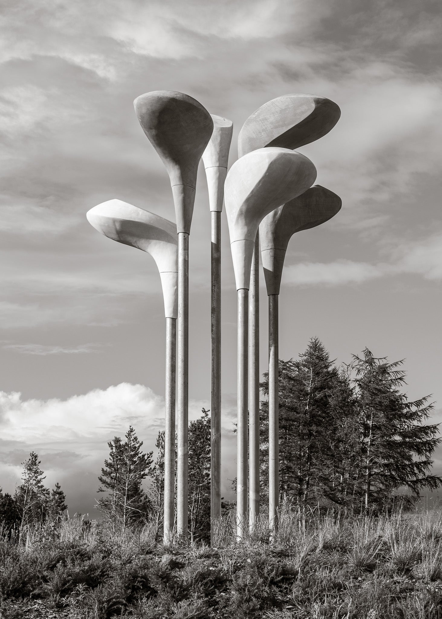 조각품은 질량에도 불구하고 무중력을 느낍니다. 트럼펫과 같은 모양은 모션을 제안합니다. 골퍼의 백스윙이나 긴 퍼팅의 아크에서 볼 수있는 것과 같은 스위핑 우아함. 각 형태는 의도적으로 하늘로 뻗어 있으며, 일종의 겸손은 마치 스코틀랜드 헤더에 마치 풍경에 속하는 것처럼 자리 잡고 있습니다. 디자인은 지형을 압도하지 않습니다. 힘과 은혜의 균형은 카메라를 잡는 것입니다. 문서화하고 싶지 않았습니다. 나는 그것을 만들고 싶었다.