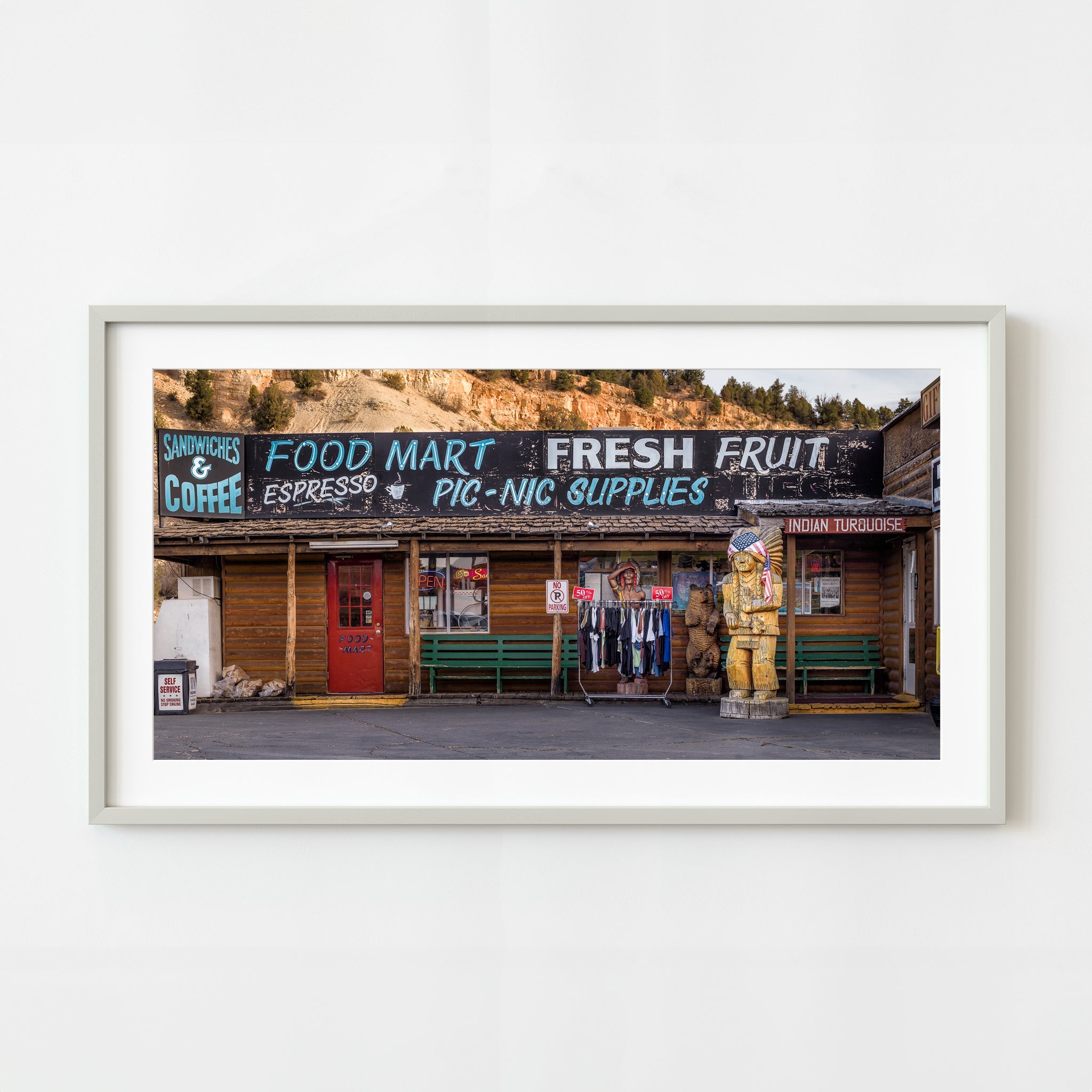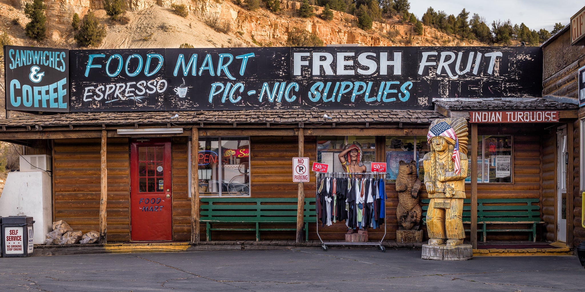 In 2009 stuitte ik op een kleine voedselmart in Utah die me meteen tegenhield in mijn sporen. Het verweerde bord uitstrekte over de blokhutgevelbeloofde broodjes, koffie, espresso, vers fruit en zelfs picknickbenodigdheden - alle benodigdheden voor een lange roadtrip door het zuidwesten. Maar waar ik me echt in trok, waren de kleine details: de vervaagde verf die uit de letters peelde, het rek van korting met korting met korting op het trottoir en de houten gravures vooraan - een van een beer en een van een figuur in een gevederde hoofdtooi met een Amerikaanse vlag.