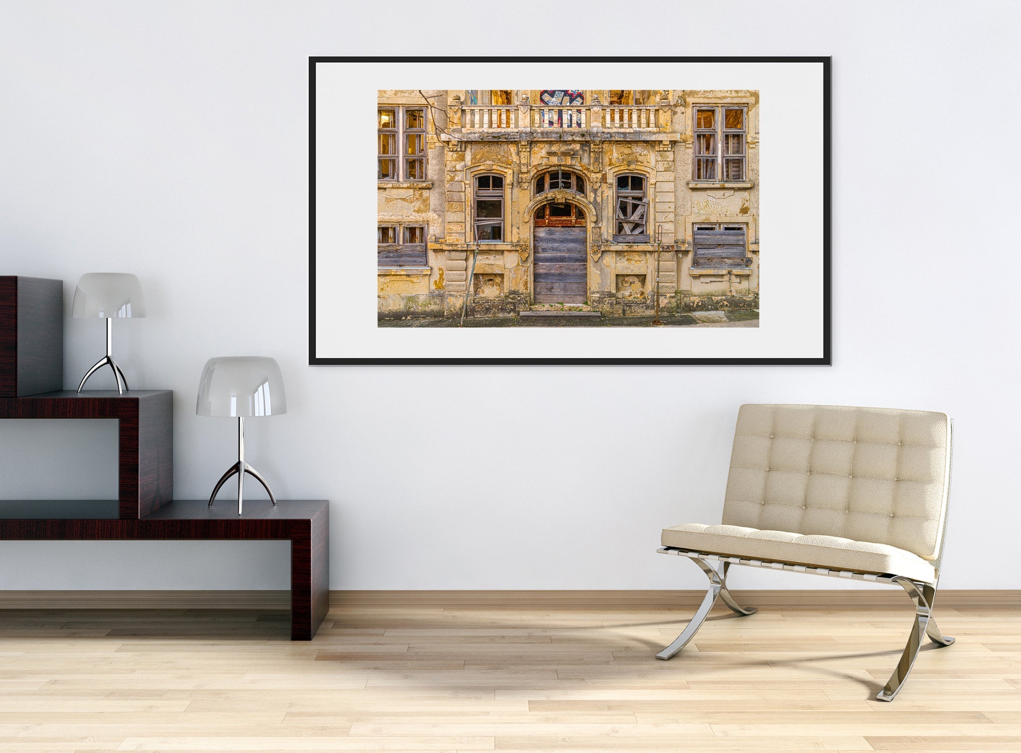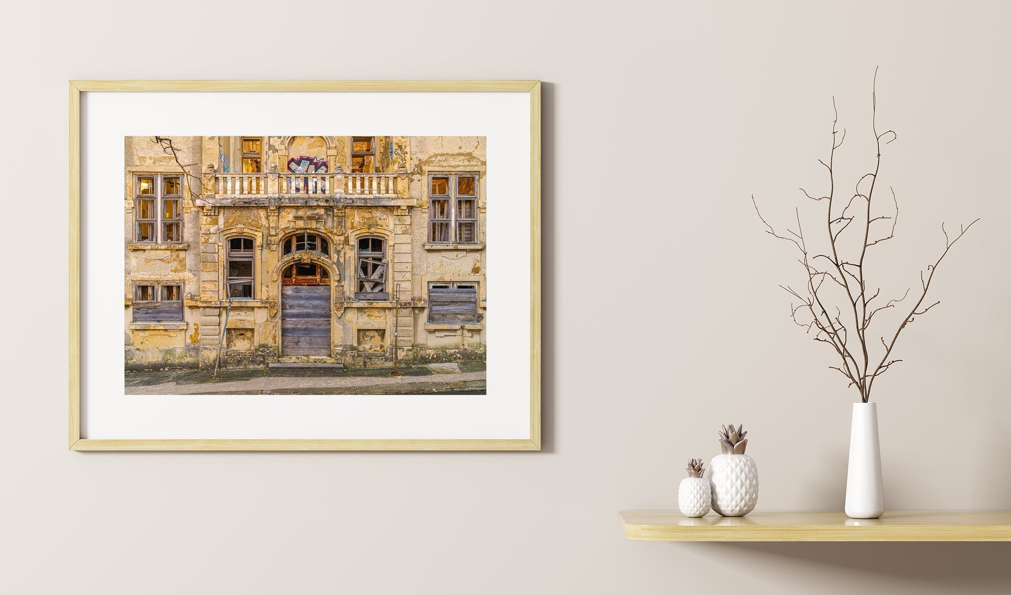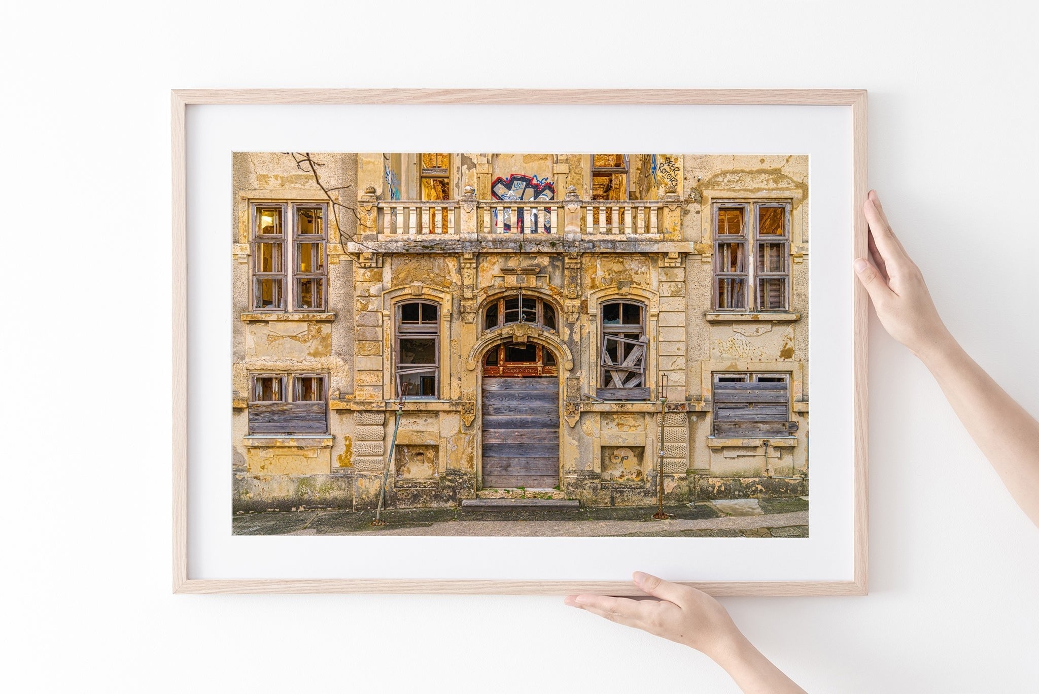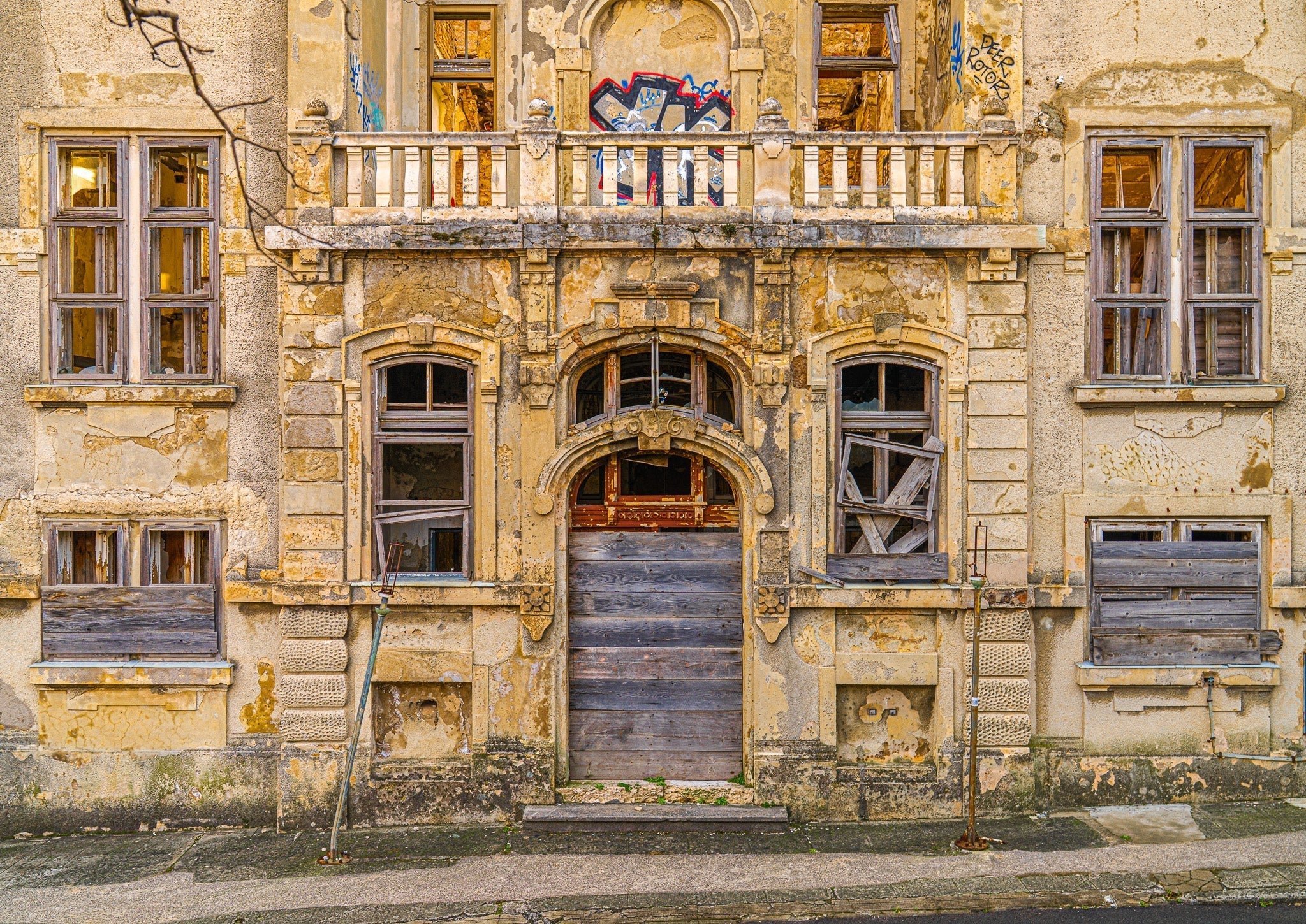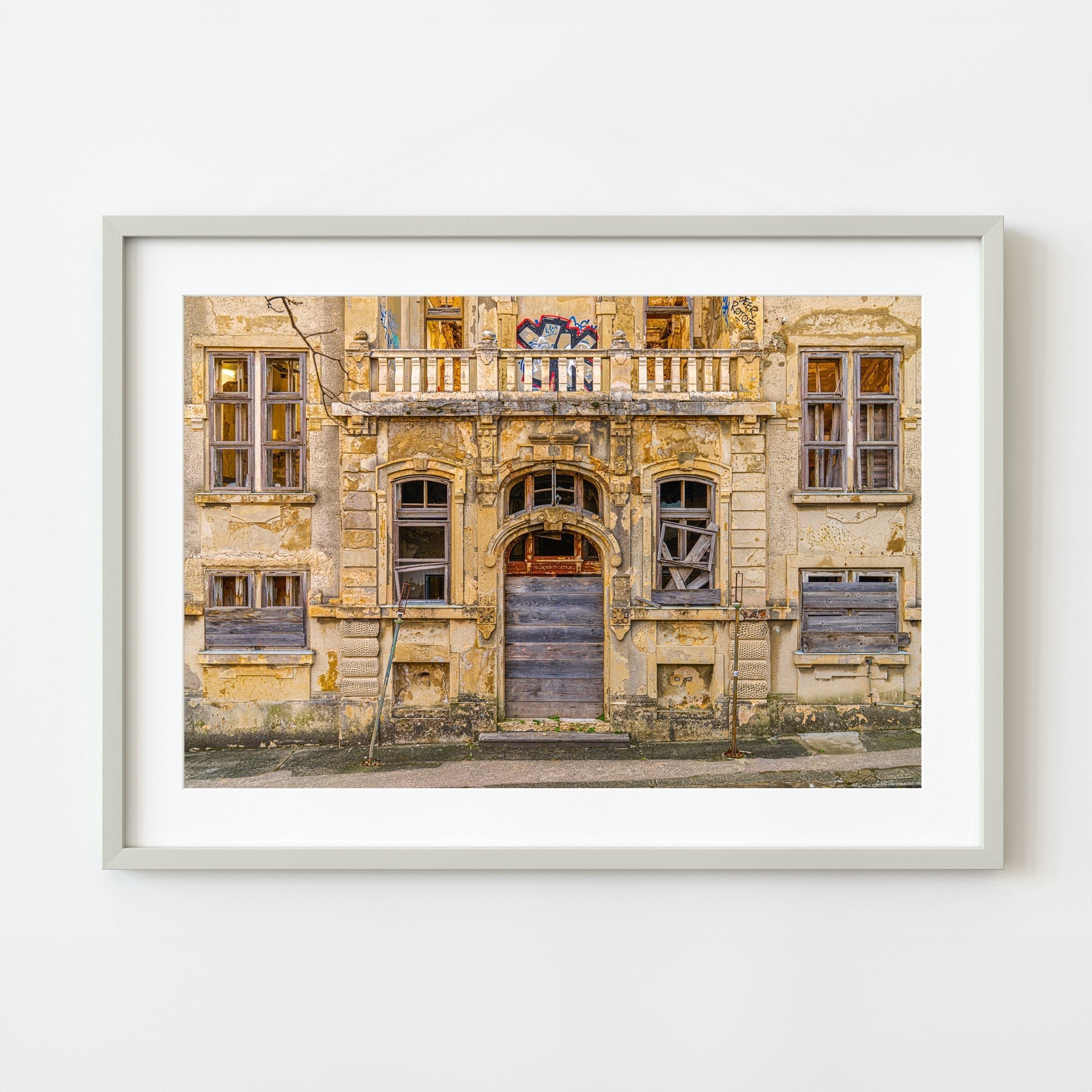 Nu houdt het allemaal nauwelijks vast. De deuropening is gebarricadeerd, ramen gebroken of aan boord van haast en graffiti kruipen in als wijnstokken. En toch is er schoonheid in die spanning - de manier waarop elegantie afbrokkelt, maar weigert te verdwijnen. Het is een van die scènes die ik bleef cirkelen, camera in de hand, proberen alles te absorberen zonder iets te storen. Een soort eerbied voor de ruïne.