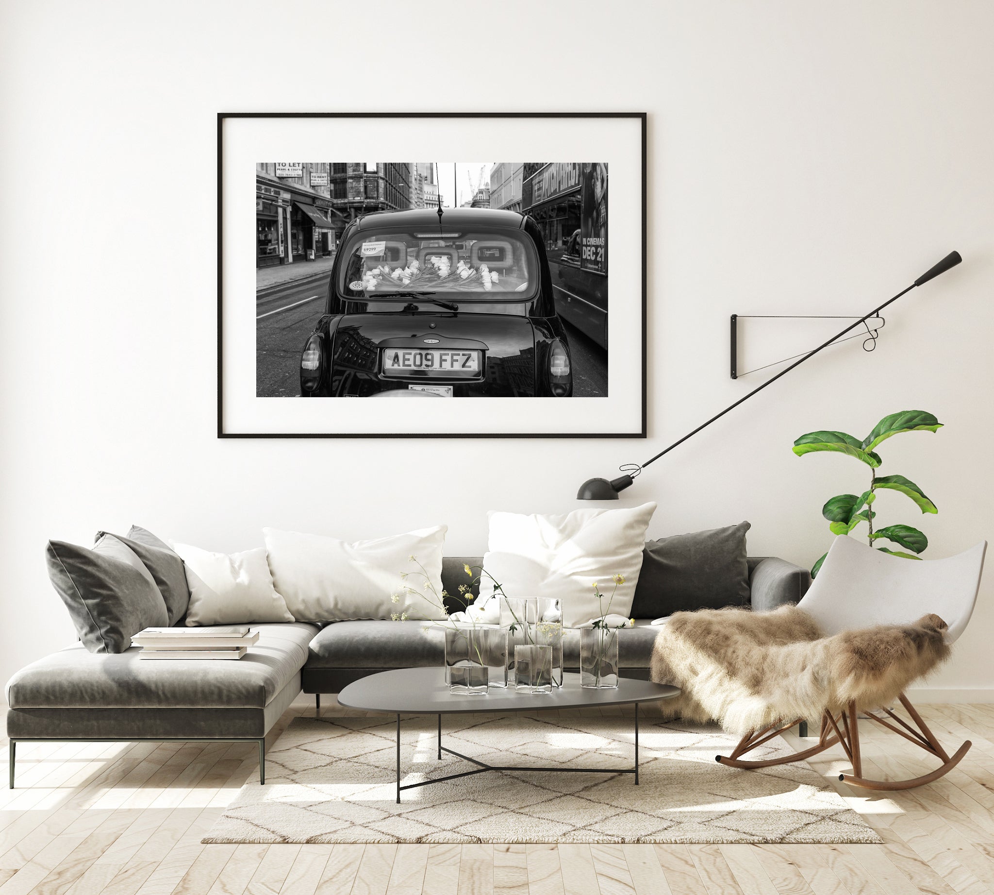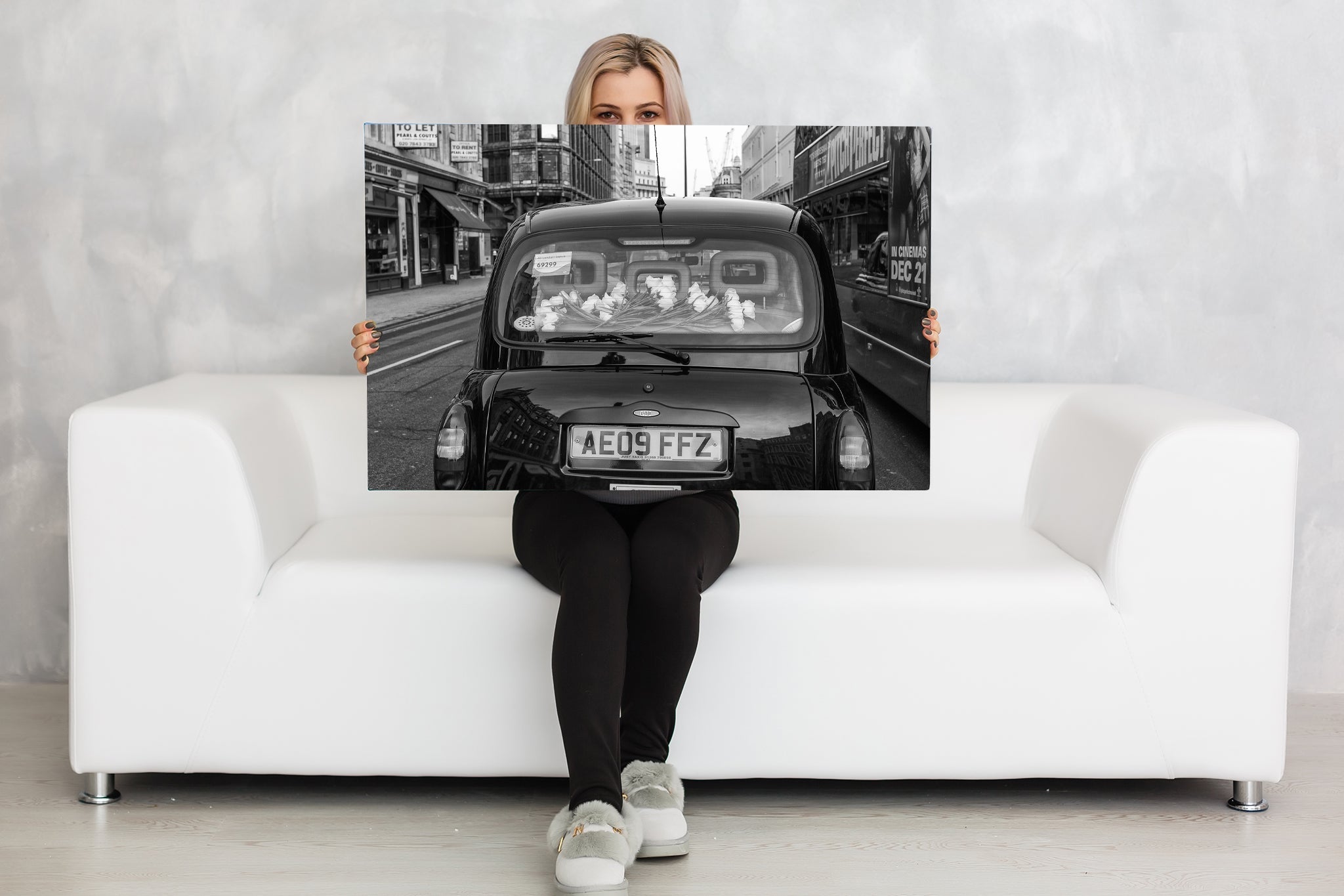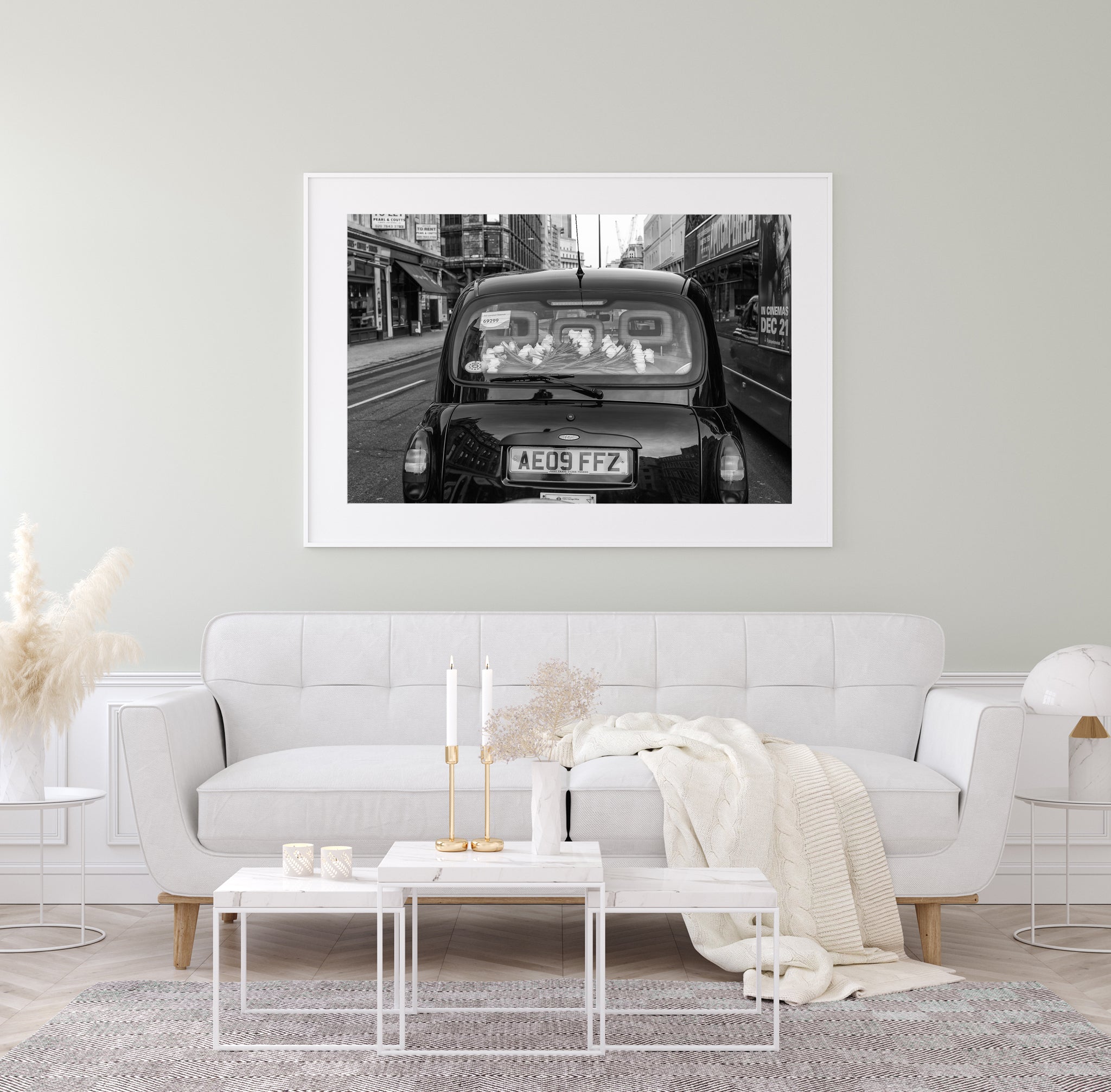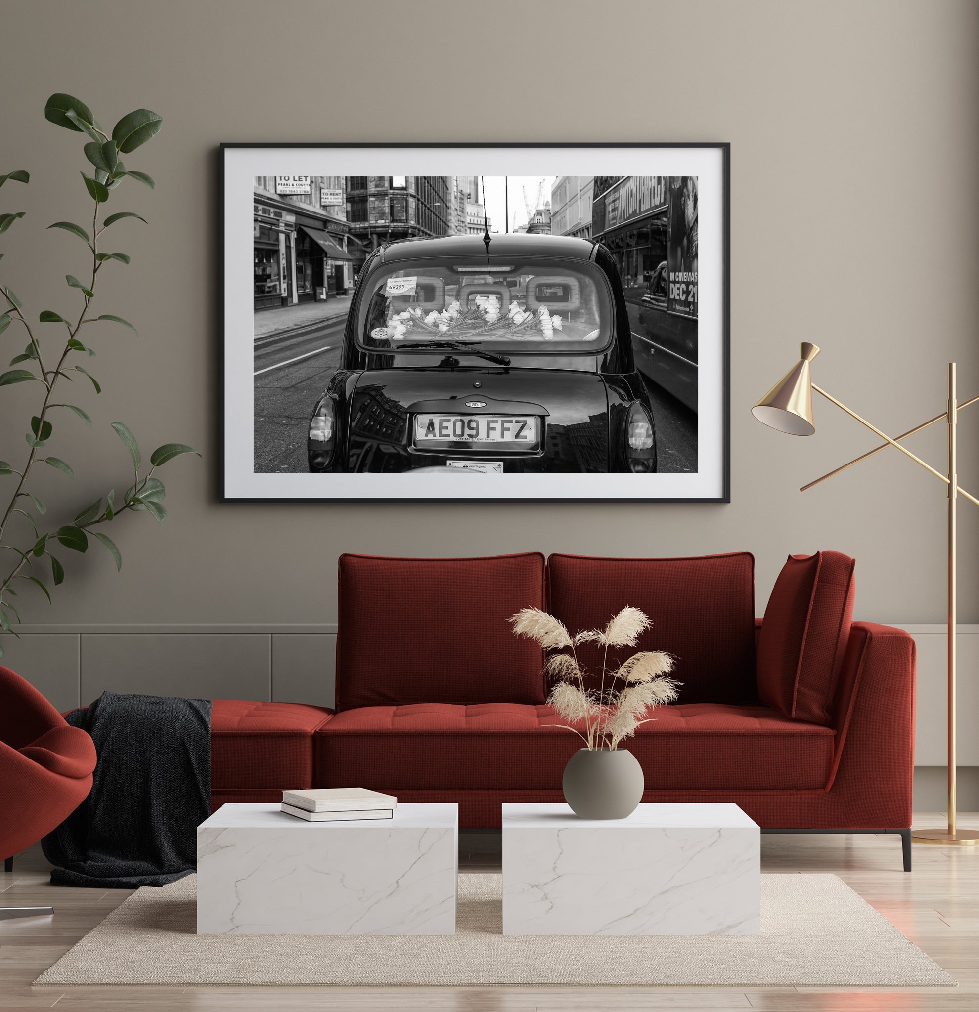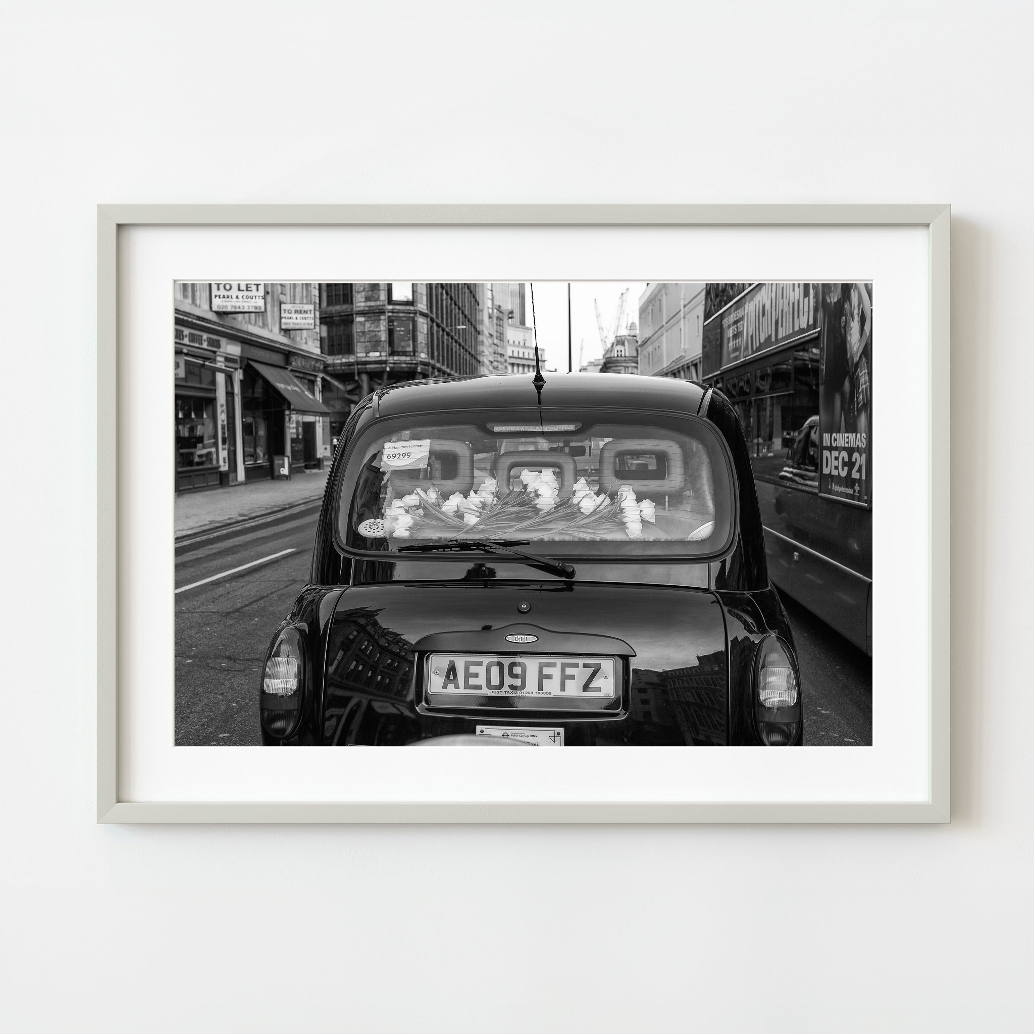 Londense taxi met witte rozen Fine Art Straatfotografie