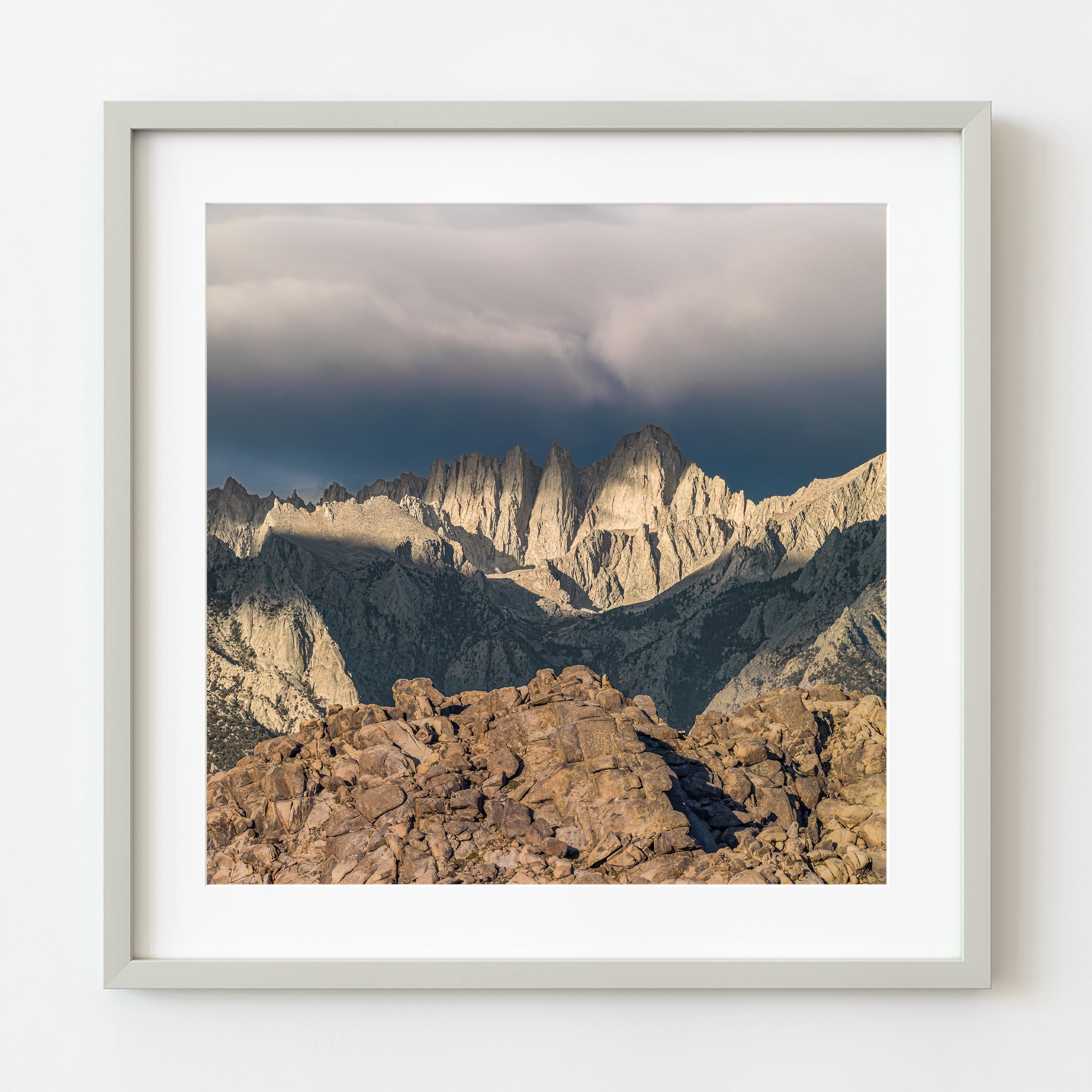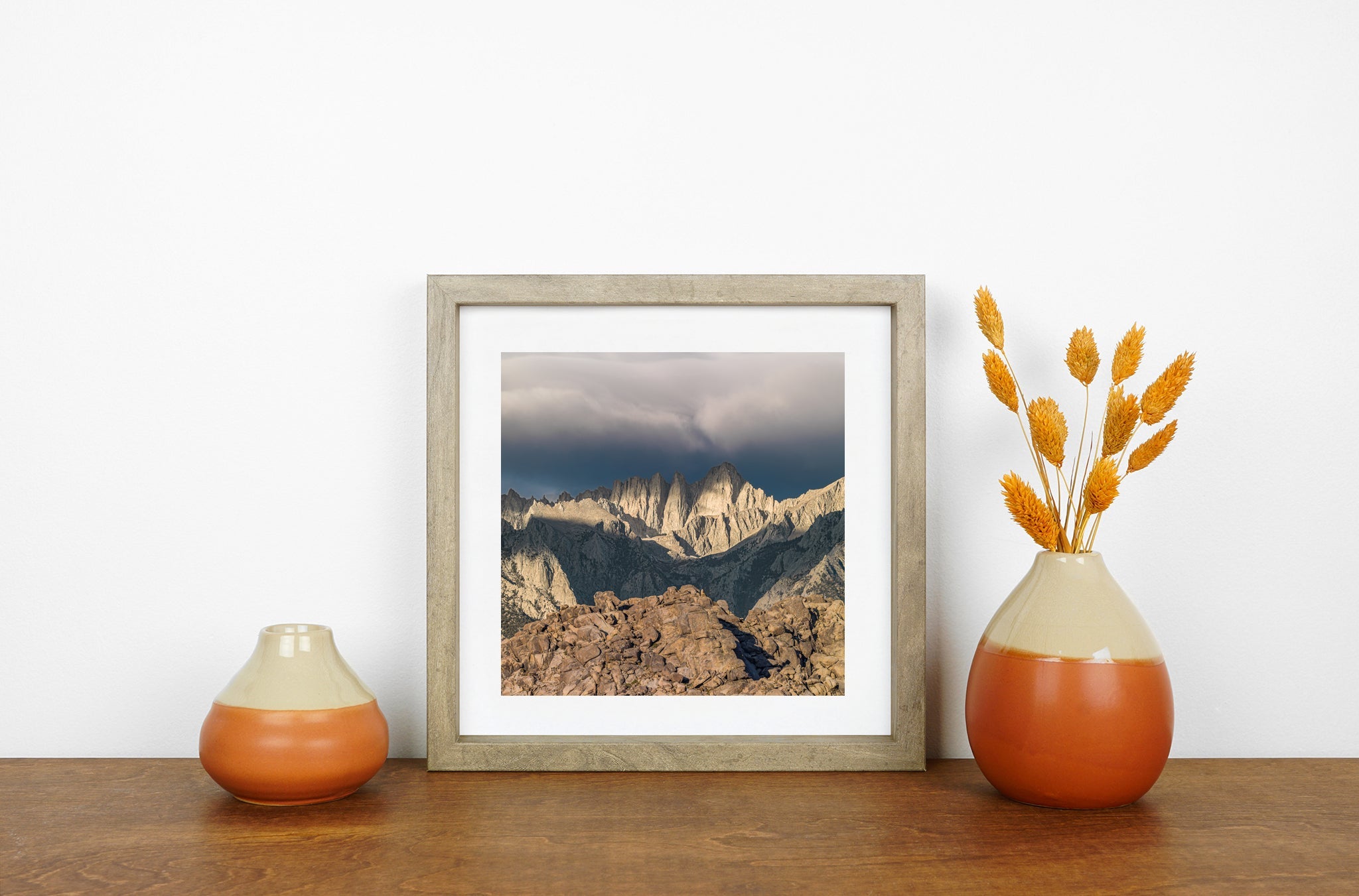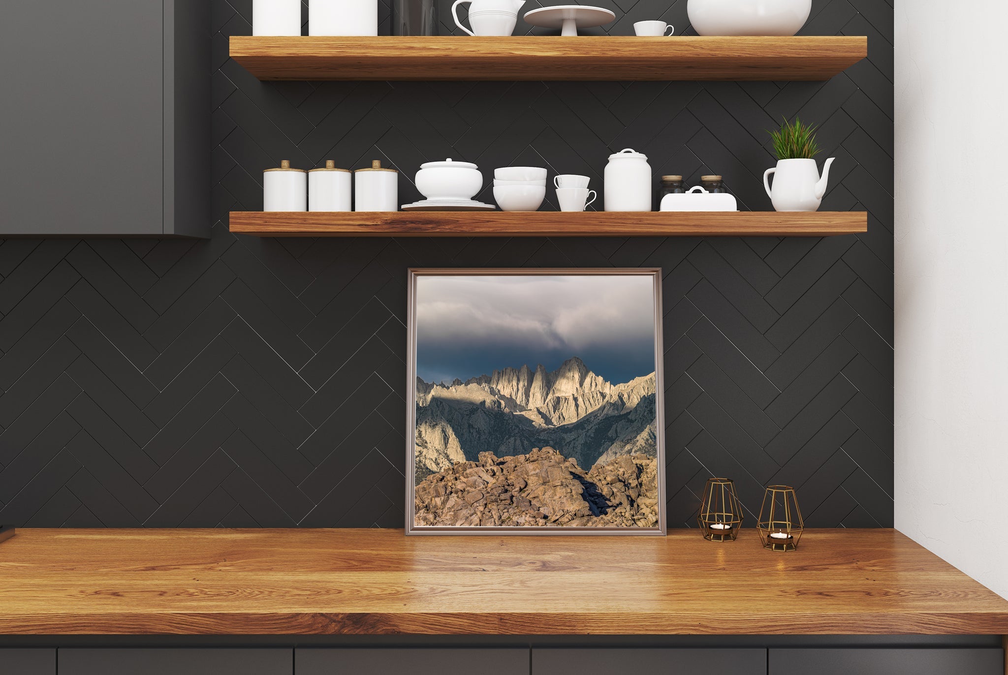 Zasięg górski, na który patrzysz, obejmuje Mount Whitney, najwyższy punkt w ciągłych Stanach Zjednoczonych. Ale ten obraz nie dotyczy wysokości - chodzi o obecność. Ostre granitowe iglice niemal świecą na zacieniony plan i burzy. To kontrast, który wydaje się ponadczasowy. Możesz się na to gapić Sztuka ścienna Przez lata i zawsze znajdź nową konsystencję, nowy kształt wyłania się z światła.