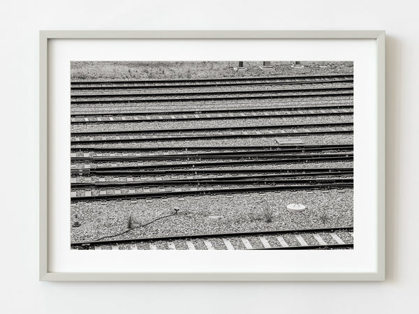 The details of the railway tracks are in sharp focus: the rusted steel of the rail, the grainy texture of the wooden sleepers, and the coarse stones of the ballast. The steel rail, robust and enduring, draws the eye along its length, inviting contemplation of the distances it spans.