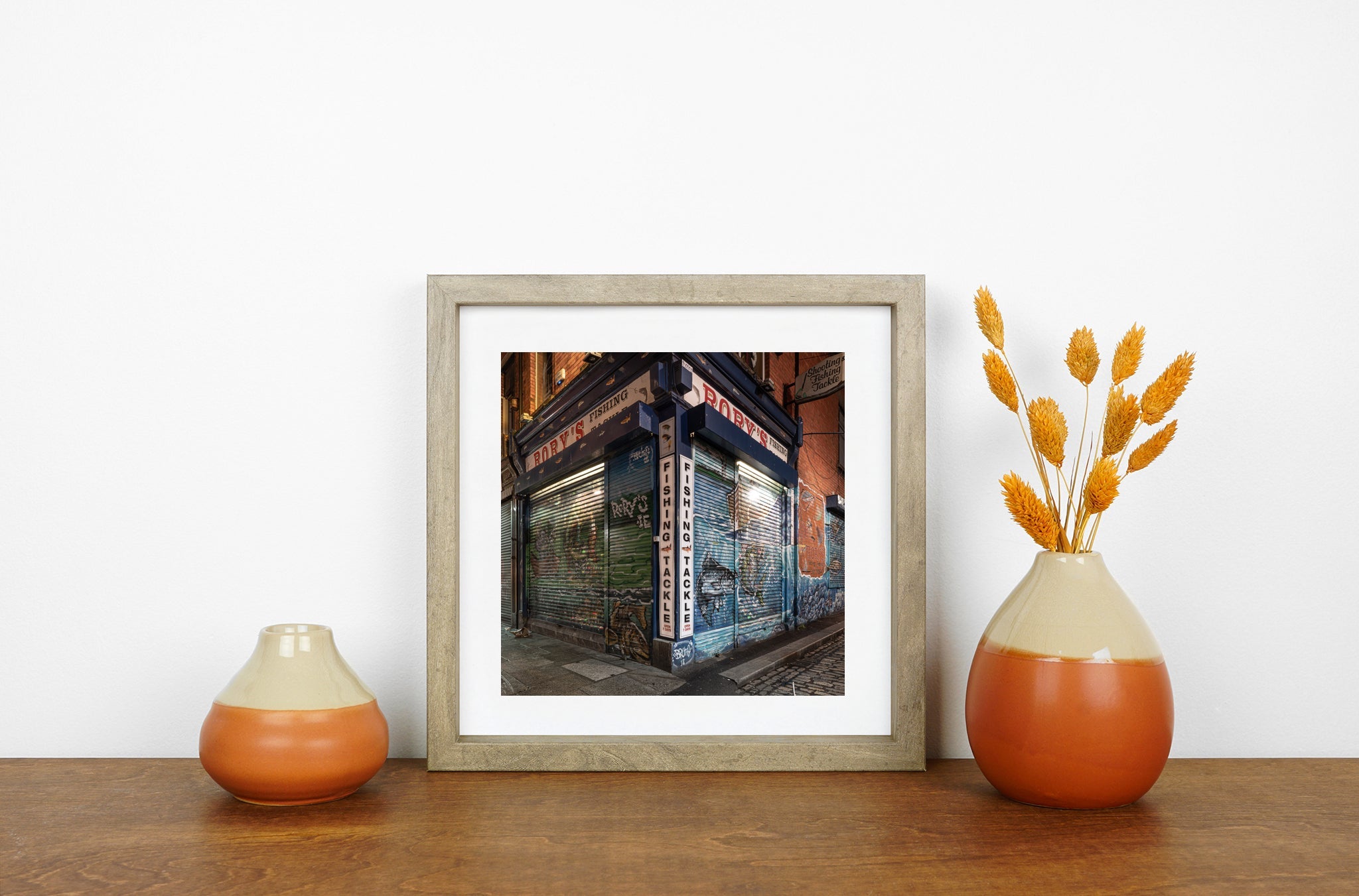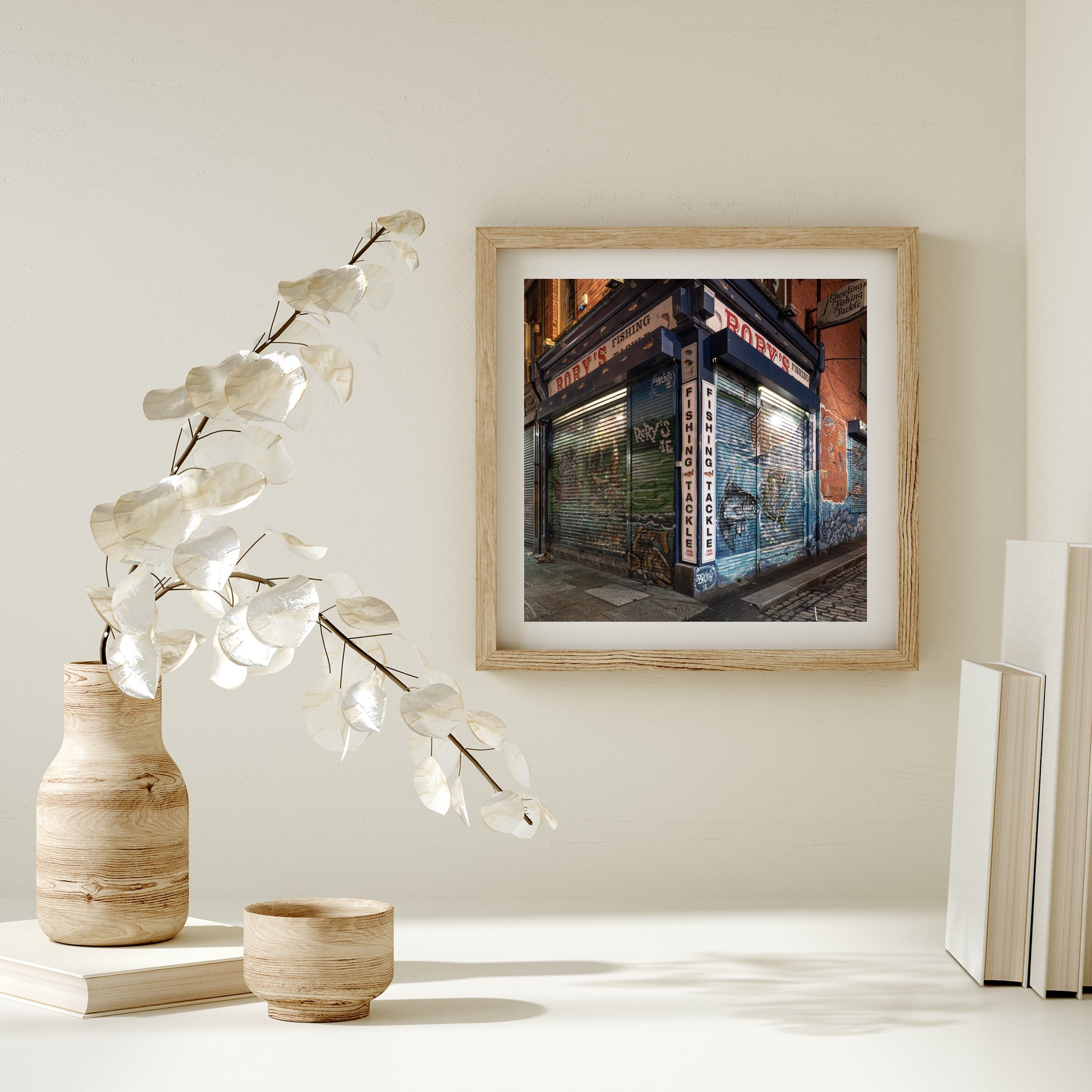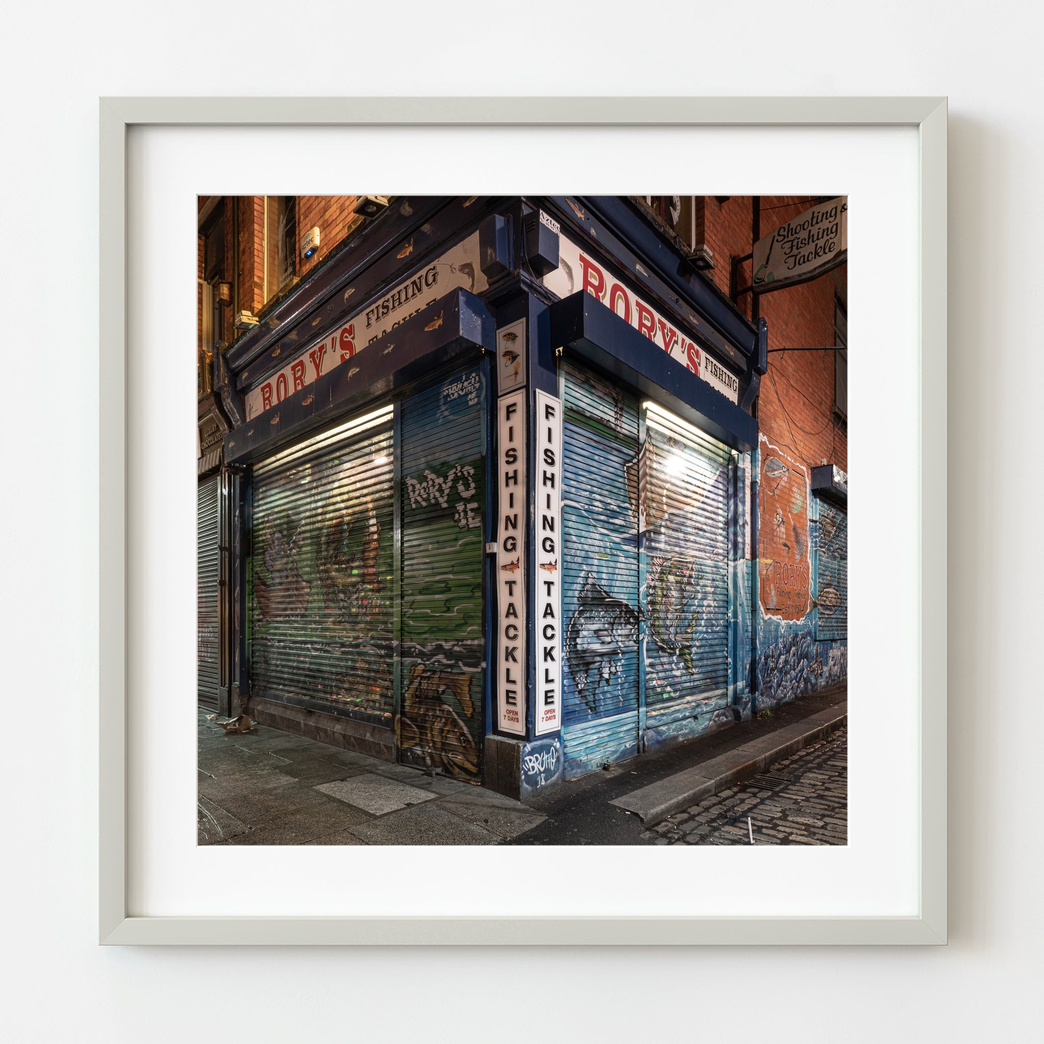 This is the side of Dublin most people walk past without noticing. It’s late. The street is empty, wet with rain. The metal shutters are pulled down tight. Rory’s Fishing Tackle, painted in vibrant graffiti, stands quietly at the corner, waiting for morning. You don’t always see Dublin like this—no crowds, no pubs spilling music, just the quiet, raw reality of a city after hours. It’s this quiet reality I wanted to capture in this fine art wall print.