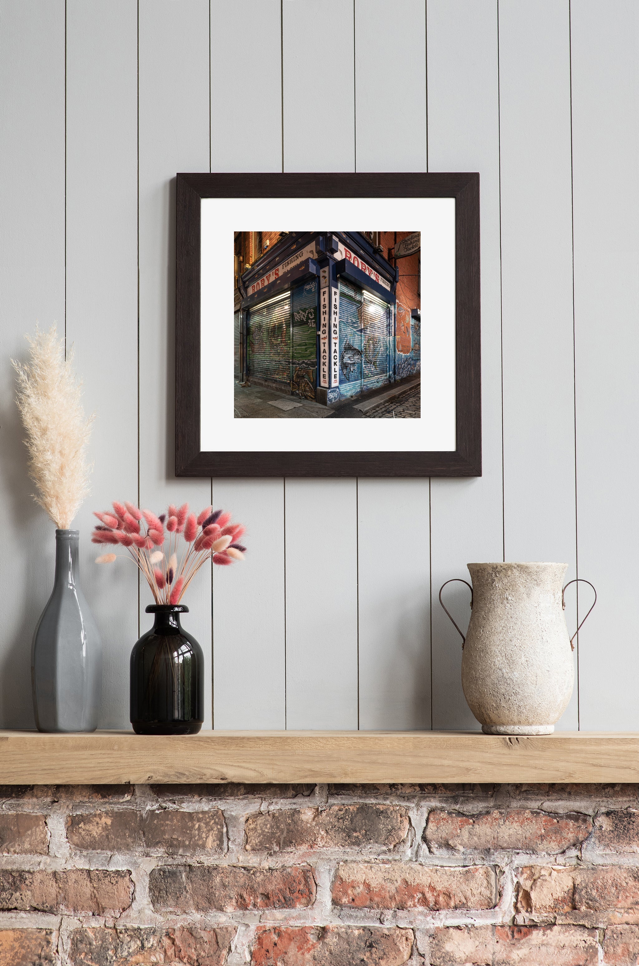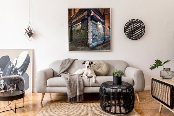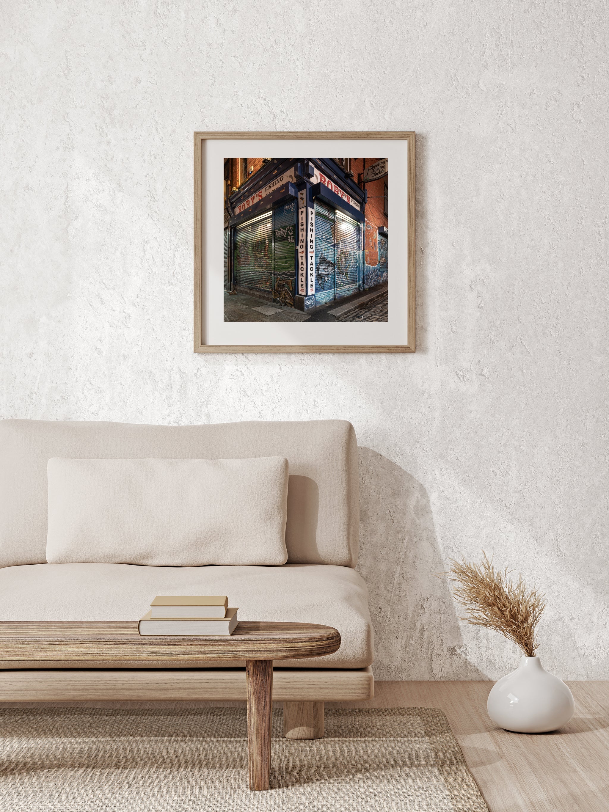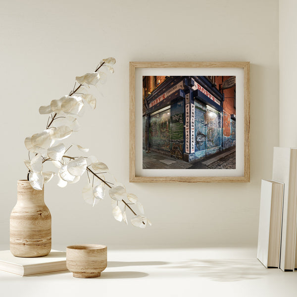 This is the side of Dublin most people walk past without noticing. It’s late. The street is empty, wet with rain. The metal shutters are pulled down tight. Rory’s Fishing Tackle, painted in vibrant graffiti, stands quietly at the corner, waiting for morning. You don’t always see Dublin like this—no crowds, no pubs spilling music, just the quiet, raw reality of a city after hours. It’s this quiet reality I wanted to capture in this fine art wall print.
