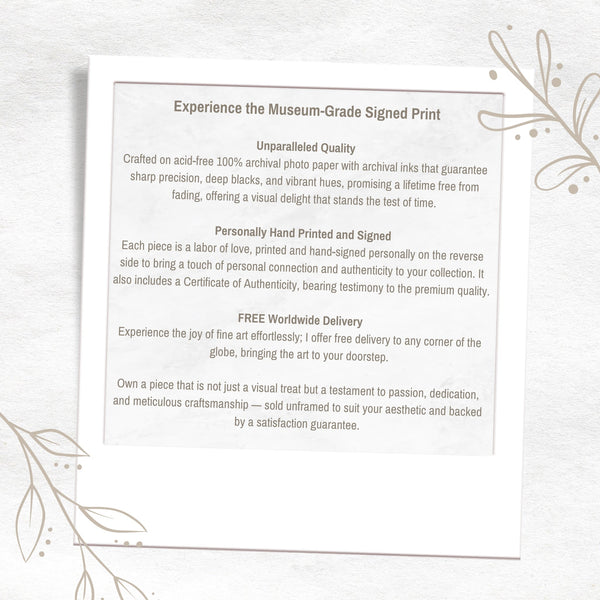 Enjoy museum-grade signed prints, free global delivery, and a 30-day satisfaction guarantee. Each fine art print showcases my passion for photography and exceptional quality and is hand-signed in pencil on the reverse side, and includes a certificate of authenticity and a lifetime warranty against fading, with the assurance of a full reimbursement within 30 days if needed.