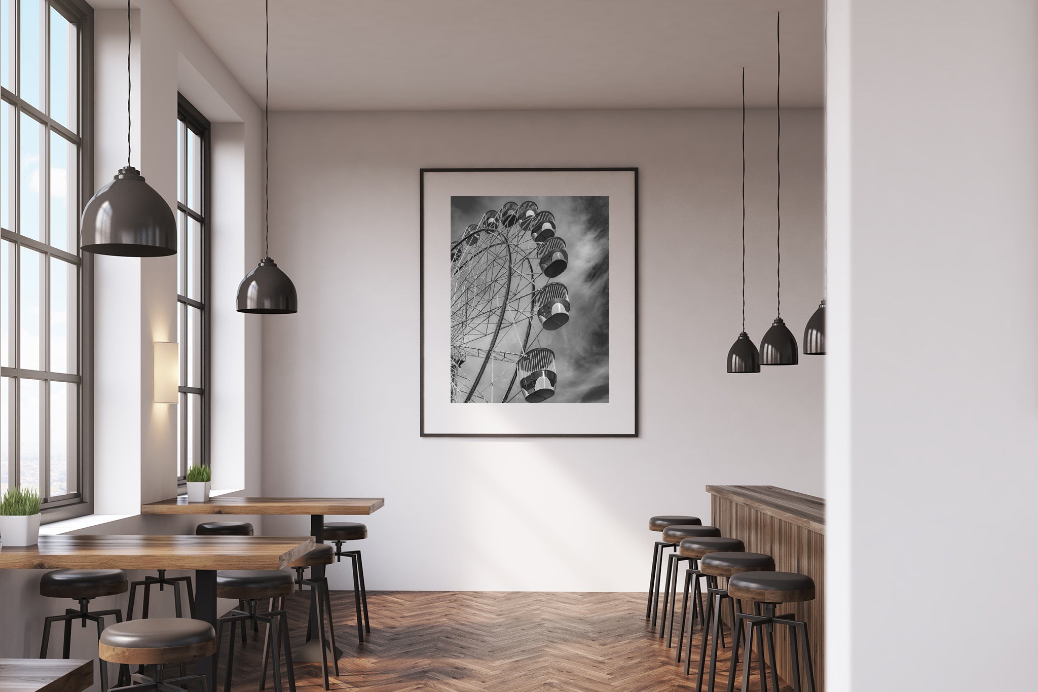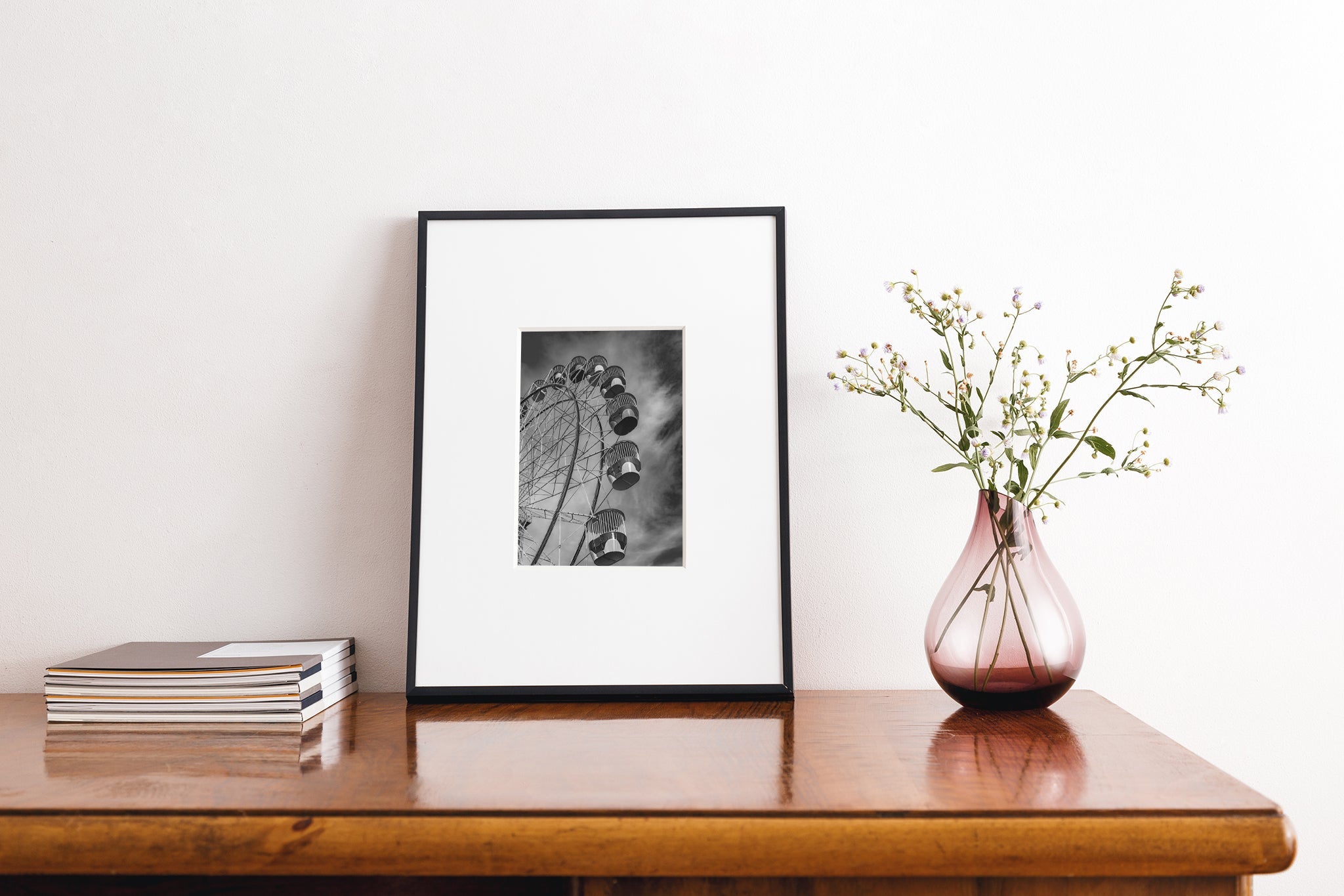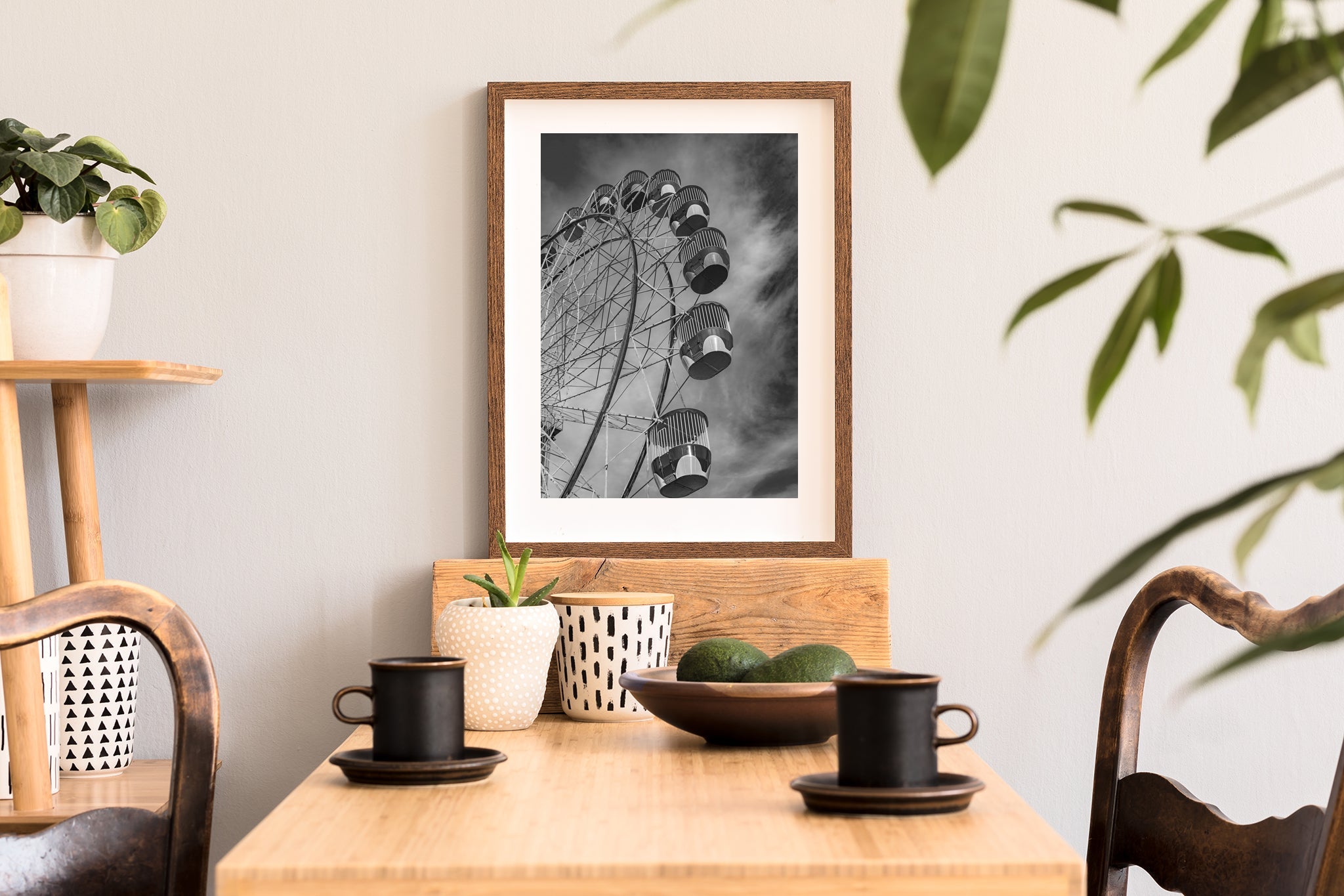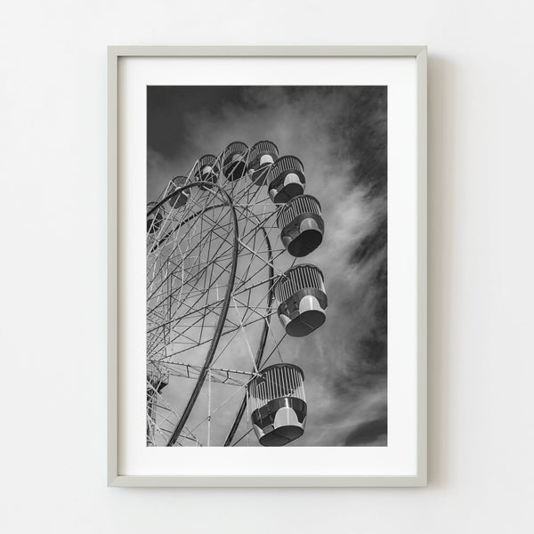 Black and white suited this scene perfectly. It strips away the carnival colours and leaves the bones—the arcs, the symmetry, the contrast between steel and sky. Without the distraction of colour, you’re left with pure structure and mood. The wheel becomes something else entirely: part sculpture, part symbol, part ghost.