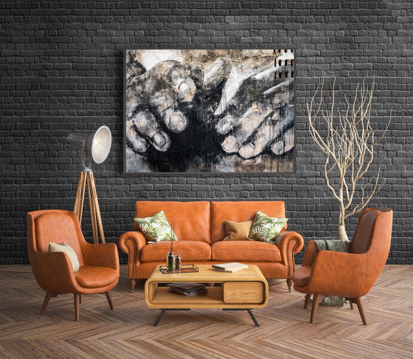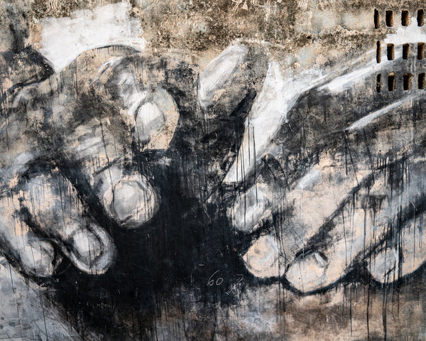 The artwork starkly contrasts the city's crumbling walls, blending history and art in a raw, visceral way. The detailed and textured fingers tell stories of labor, connection, and endurance. The smudged and dripped paint gives the piece an unfinished yet deeply impactful appearance.