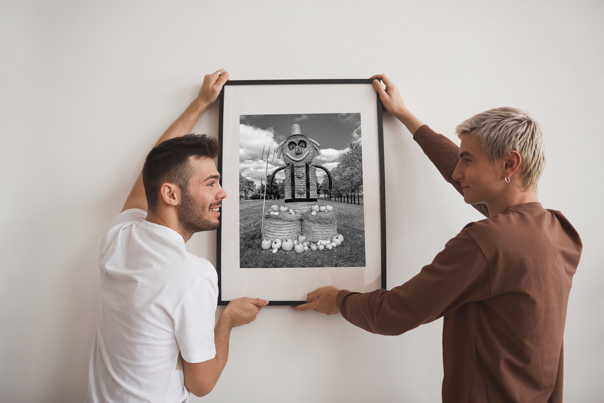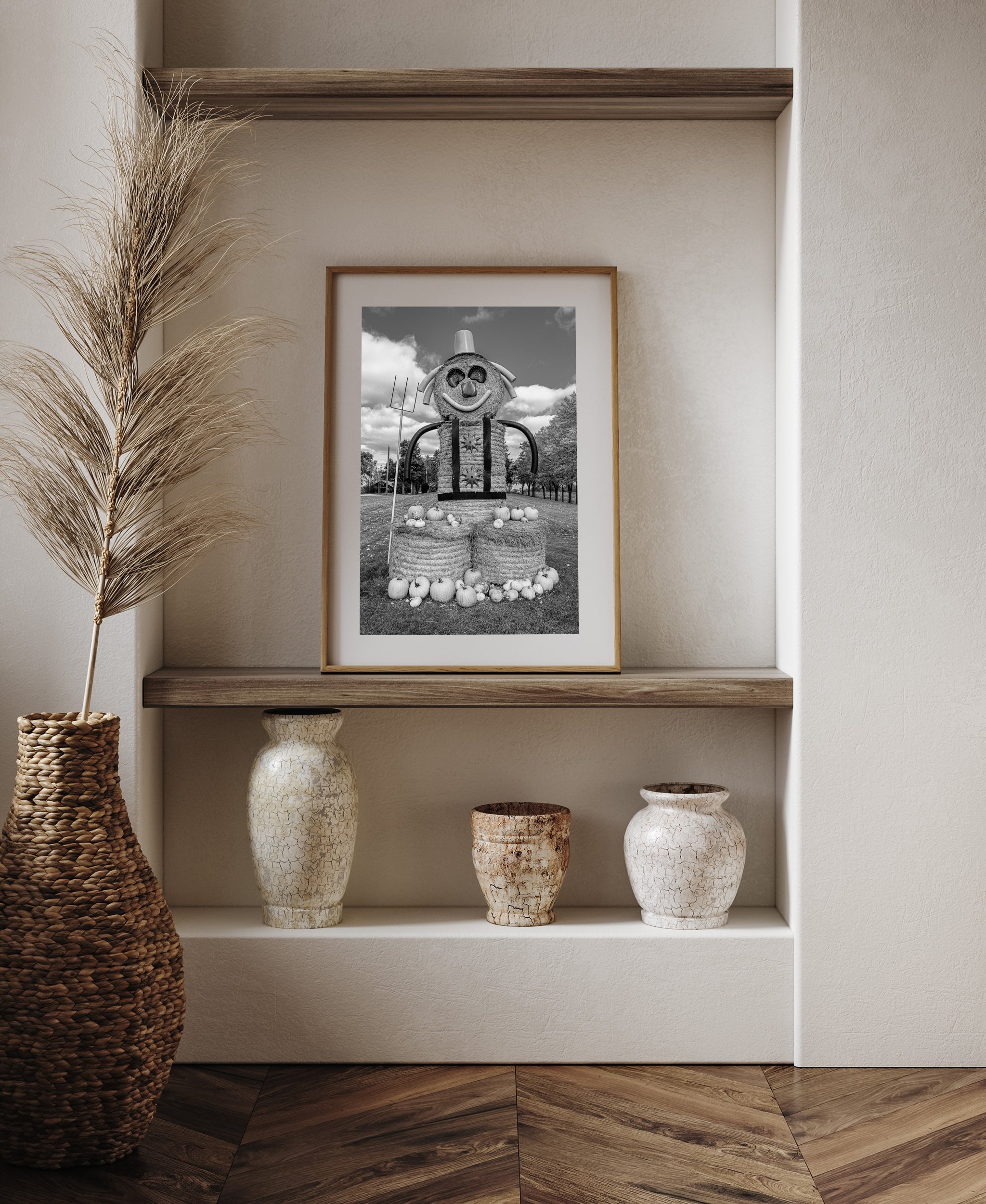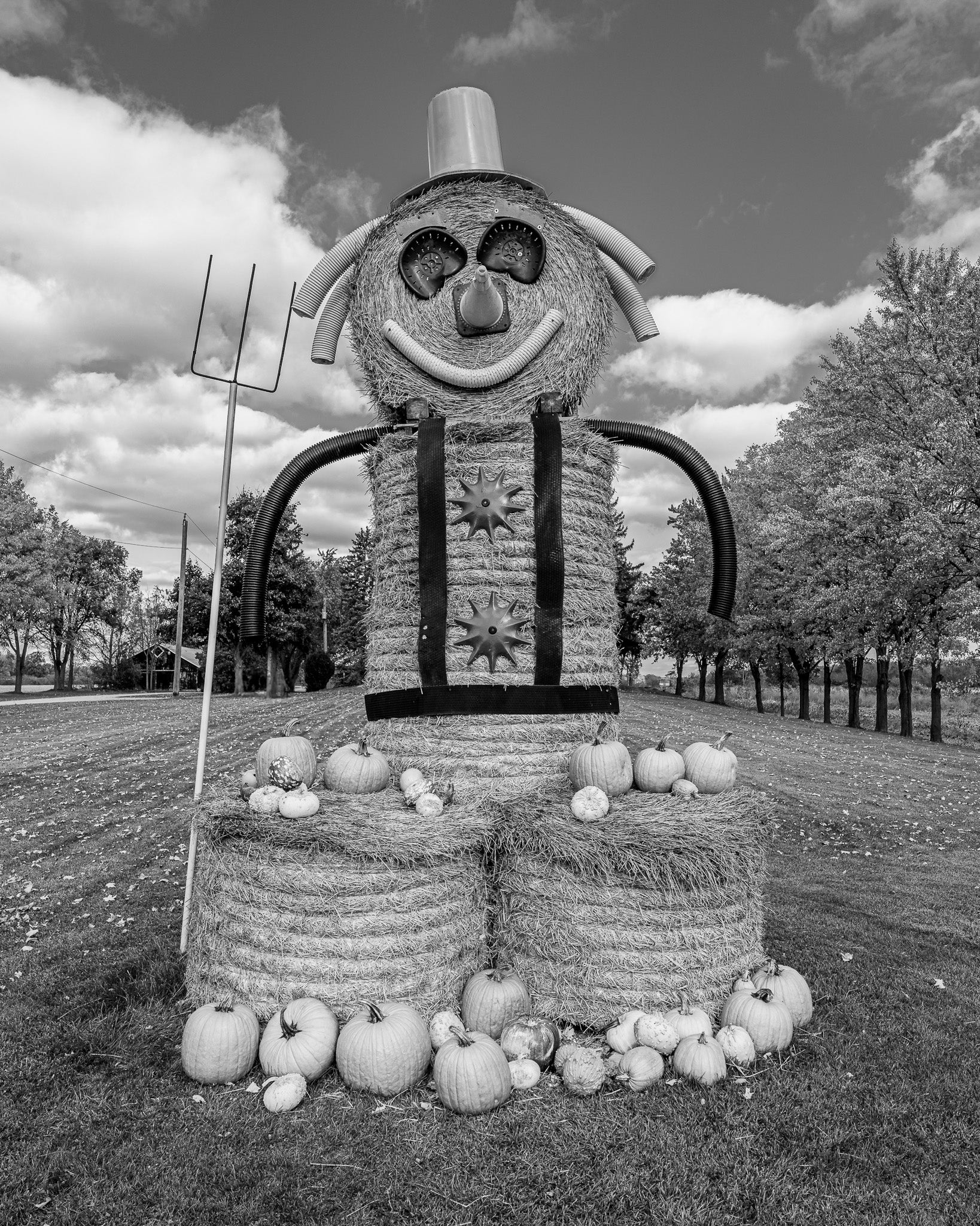 This particular creation, a towering scarecrow-like figure made of hay bales, is decked out with a cheerful grin, outstretched arms, and a collection of pumpkins gathered at its feet. It’s both whimsical and a little surreal, especially captured here in black and white. The absence of colour turns what could easily be seen as festive into something slightly eerie—like a page pulled from a storybook where rural life and imagination collide. That’s the charm of monochrome: it strips away the obvious cues and leaves you with mood, texture, and shape.