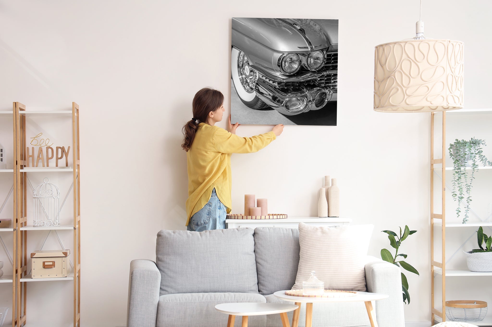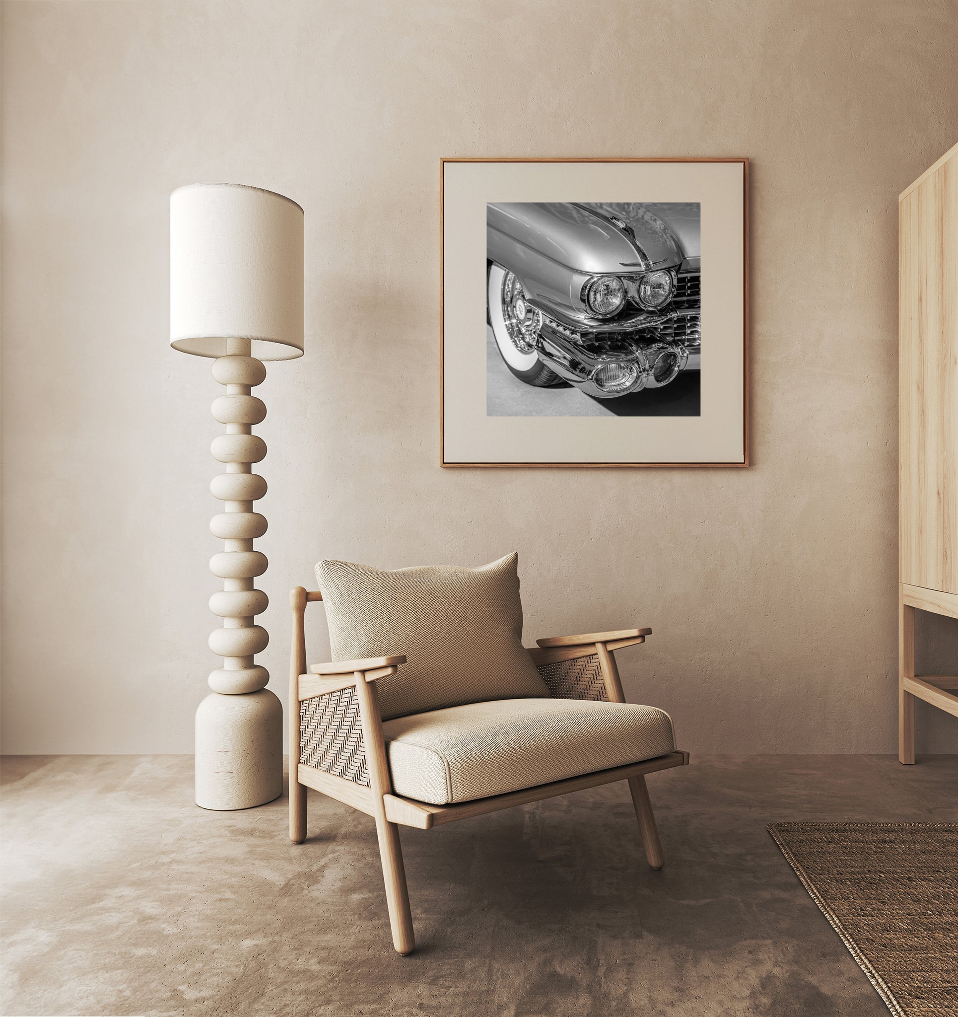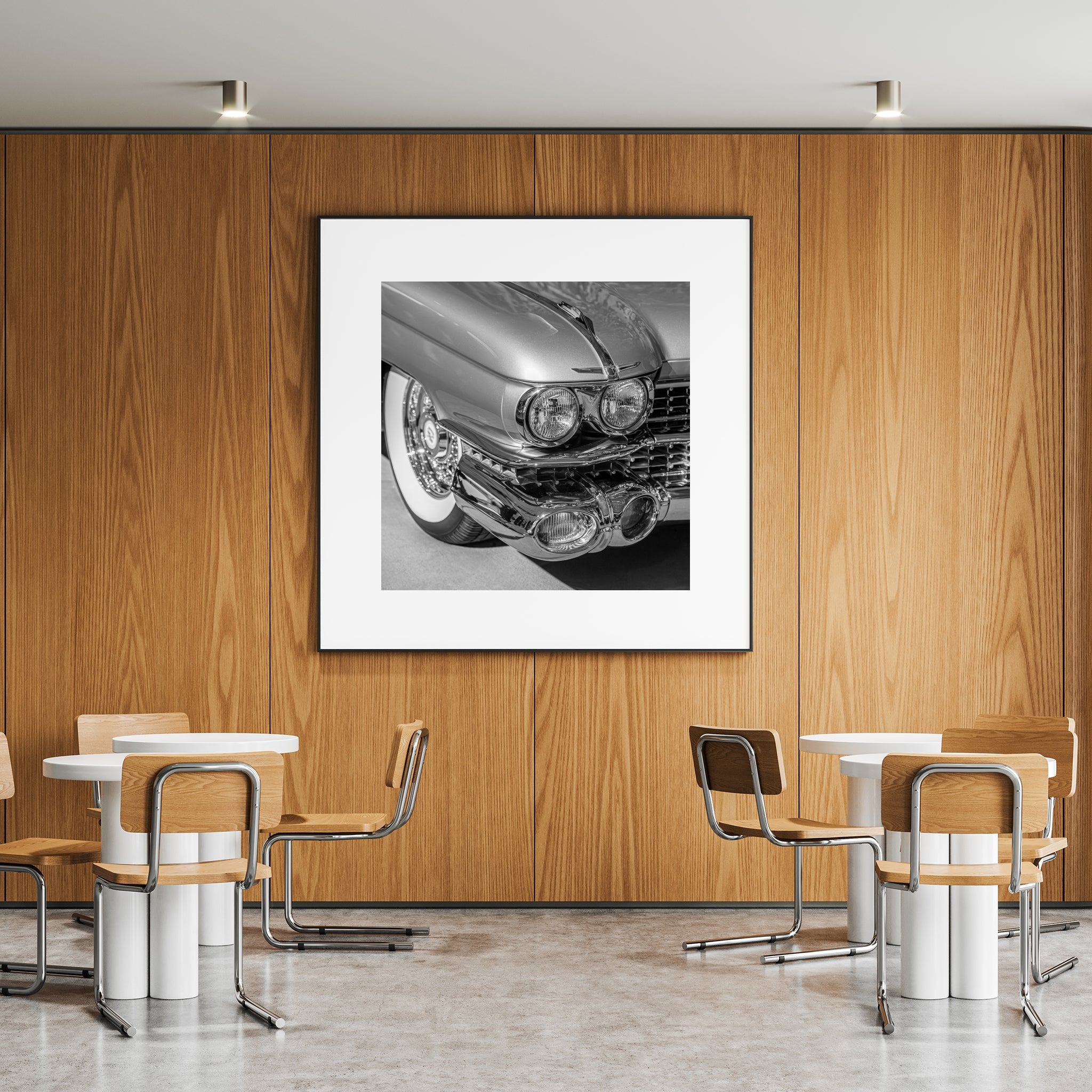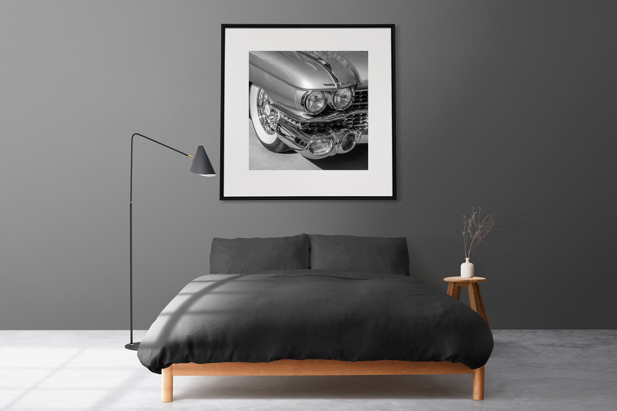 The monochrome palette lets the shapes take centre stage. The contrast of polished chrome against soft shadows, the sweep of the whitewall tire just behind the fender—it’s a study in excess done right.