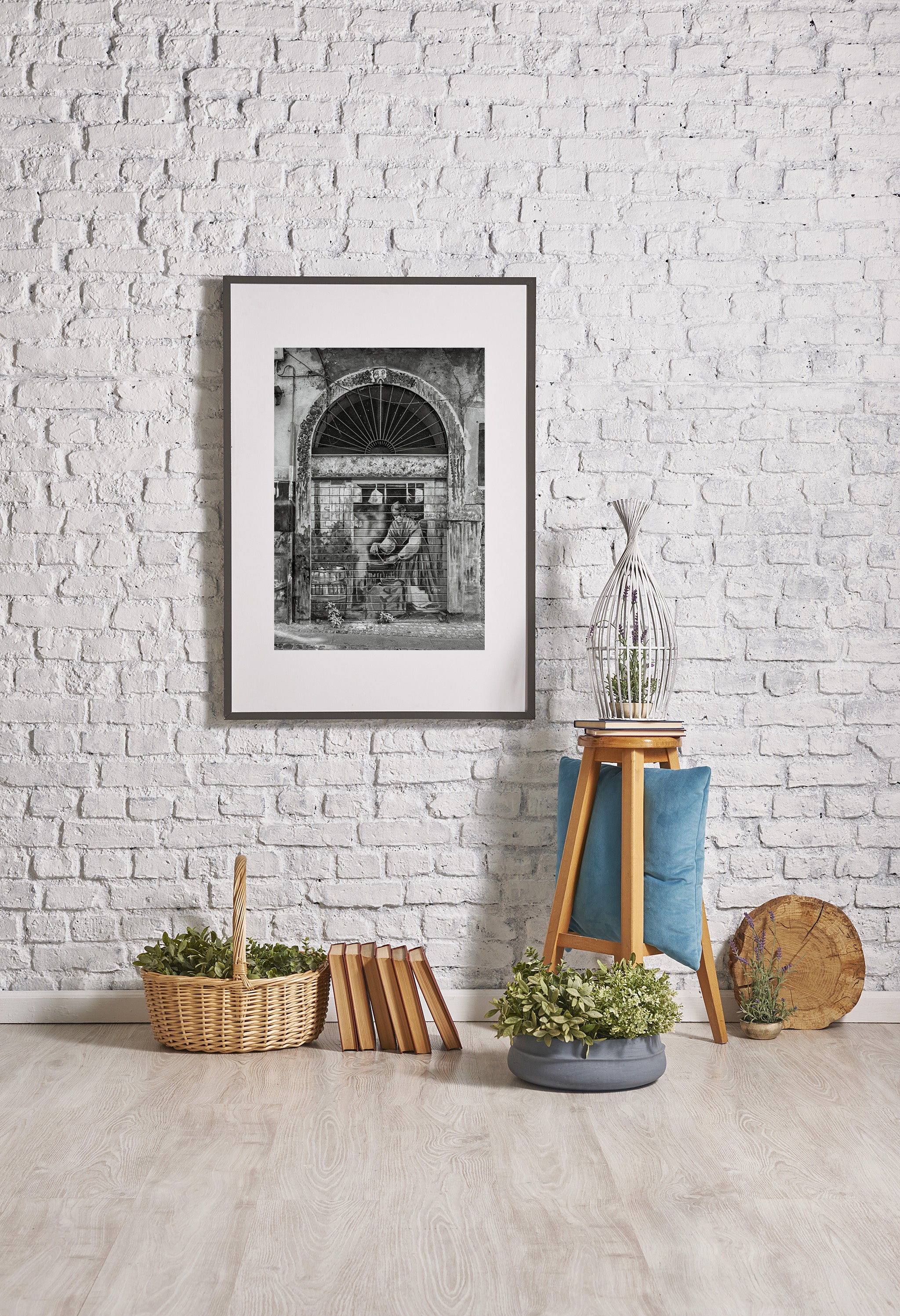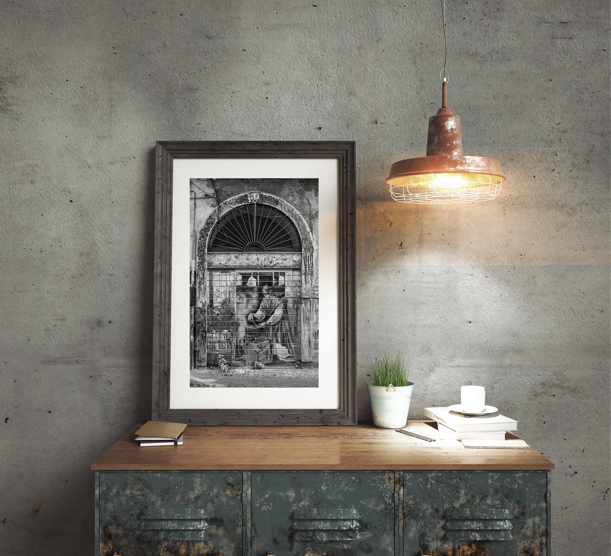 Tucked into a worn doorway along a narrow street in Tivoli, this painted figure works quietly behind a metal shutter, framed by cracked plaster, soot-stained stone, and the subtle geometry of an arched window above. At first glance, it feels like a simple street mural. But the longer I stood there, the more the scene began to feel like a memory that had settled into the architecture itself.