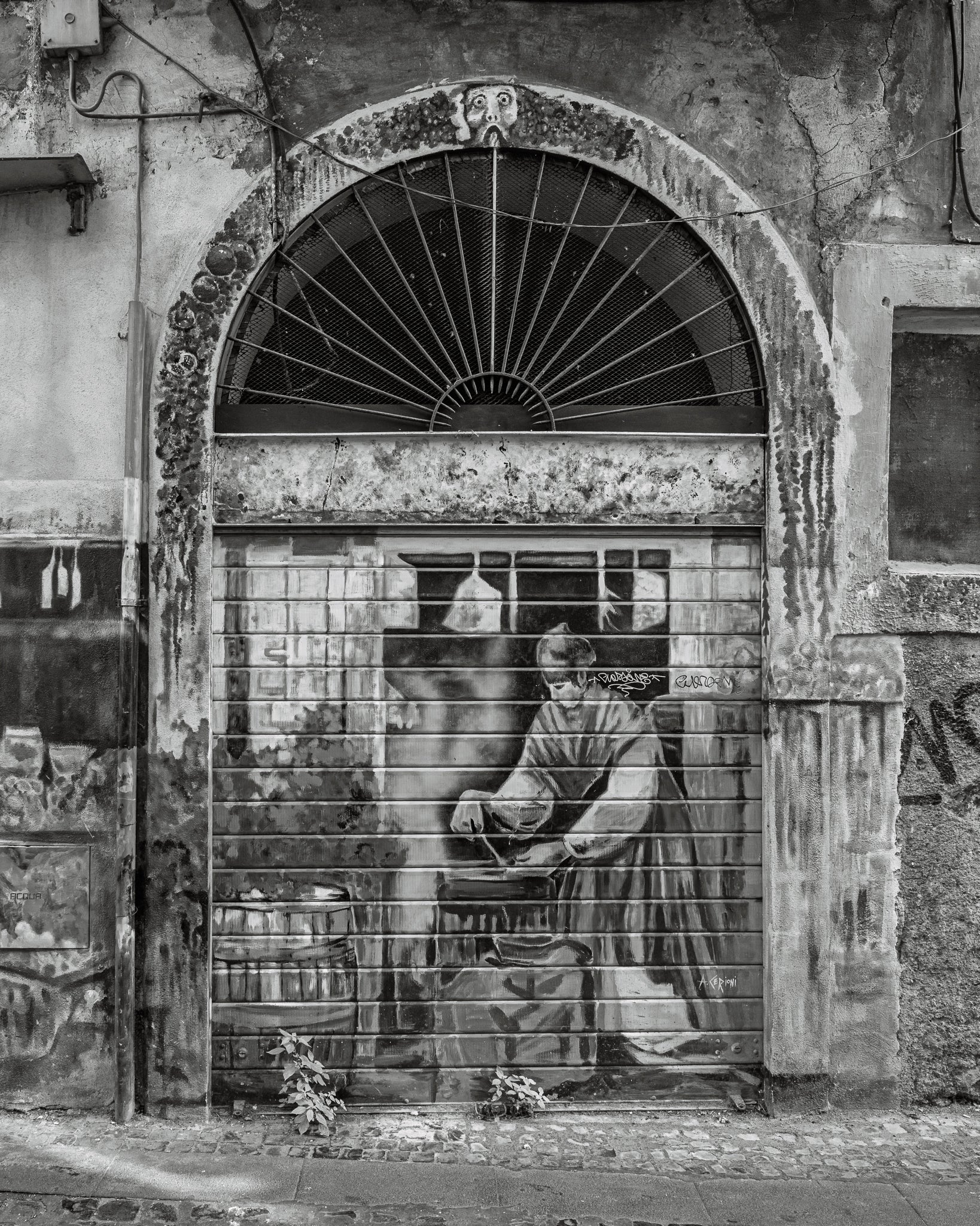 The radial fan above the arch spreads outward like a silent halo, drawing the eye downward toward the woman's hands as she leans into her task. The gesture is small, deliberate, and almost meditative. Around her, the building tells a different story entirely. Electrical conduit cuts across the upper wall. Rain streaks run vertically down the aging plaster. Rust stains and chipped paint create their own patterns across the shutter’s surface. Even the small weeds pushing up through the cobblestones at the base of the door add to the sense that time here moves slowly and without ceremony.