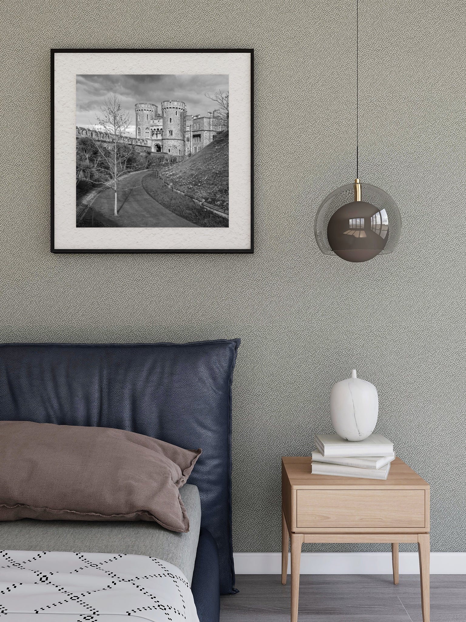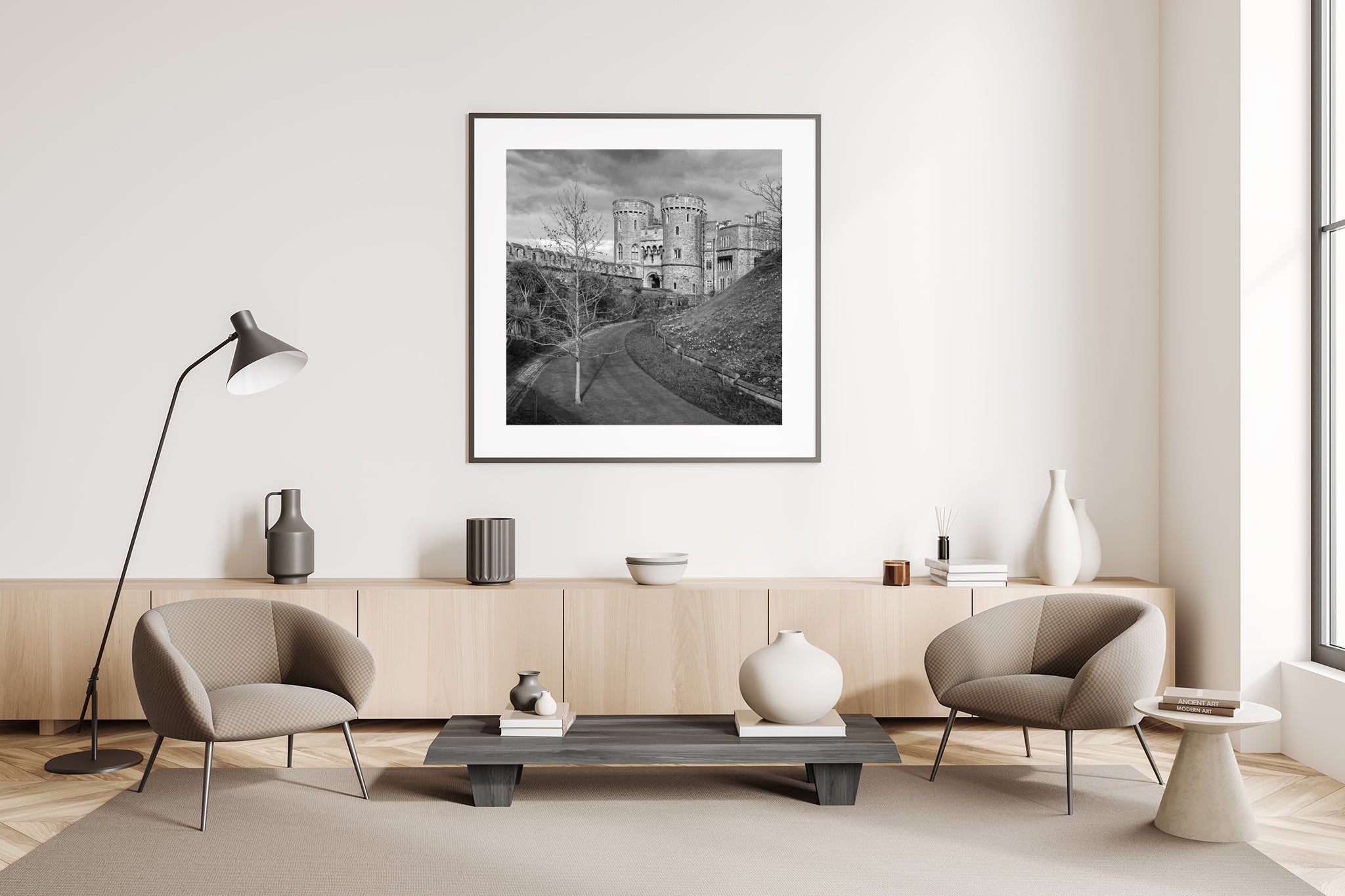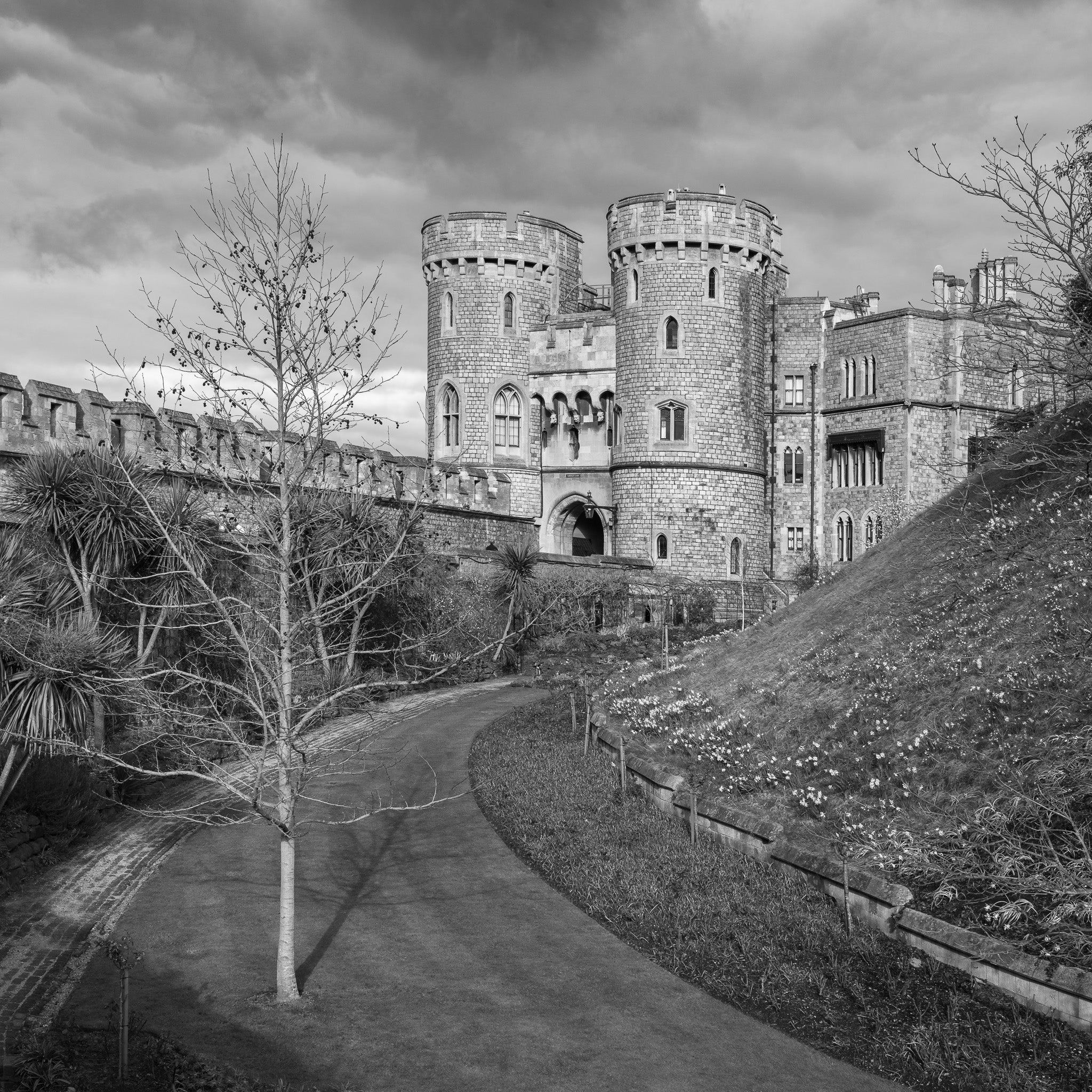 I rendered the photo in black and white to focus on form, shadow, and presence. No tricks. No digital embellishment. Just the structure as it stood, under that brooding English sky. It’s a visual study in contrast—light and stone, fragility and permanence, moment and memory. The soft natural textures play against the rigid geometry of the castle walls. The curve in the path offers movement, while the towers stand still and imposing.
