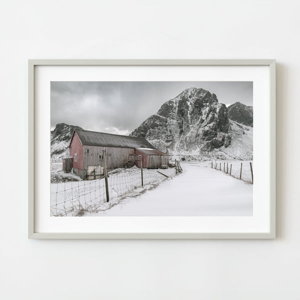 Serene Beauty: Snow-Covered Barn in Flakstad, Norway - Fine Art Print
