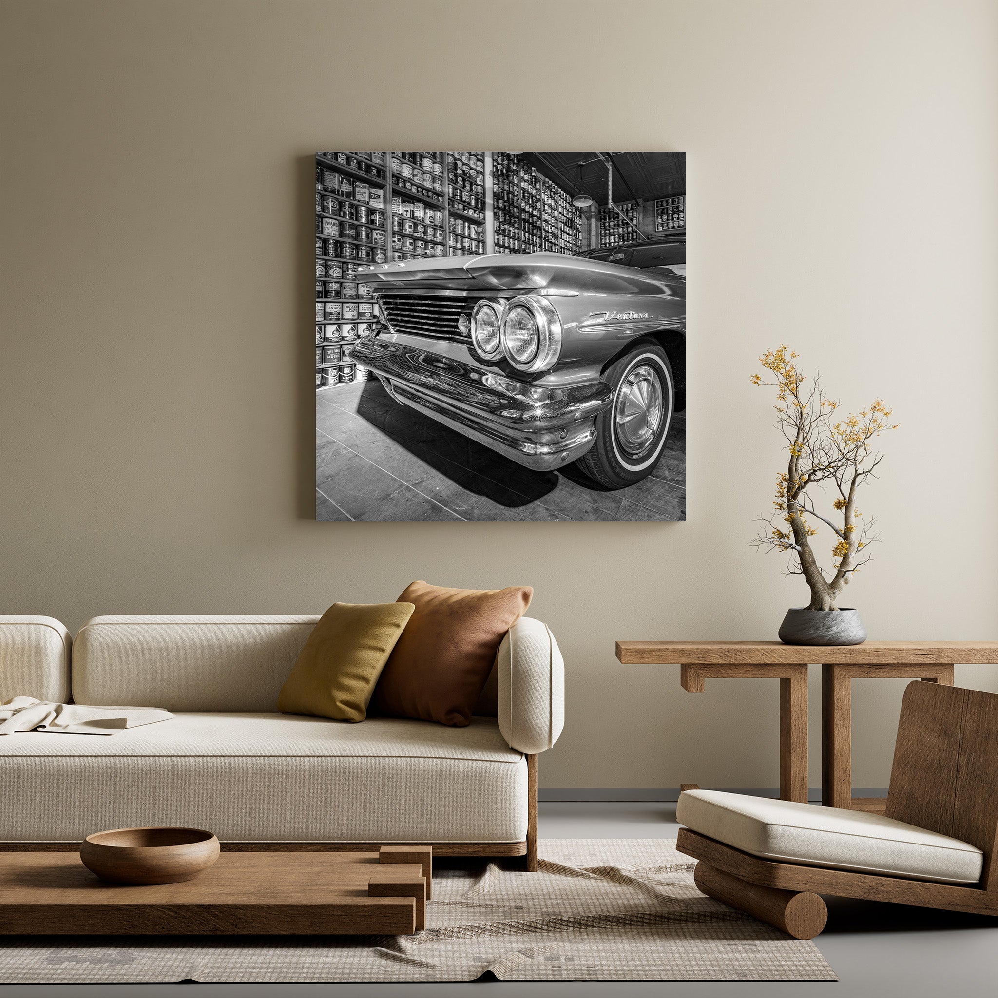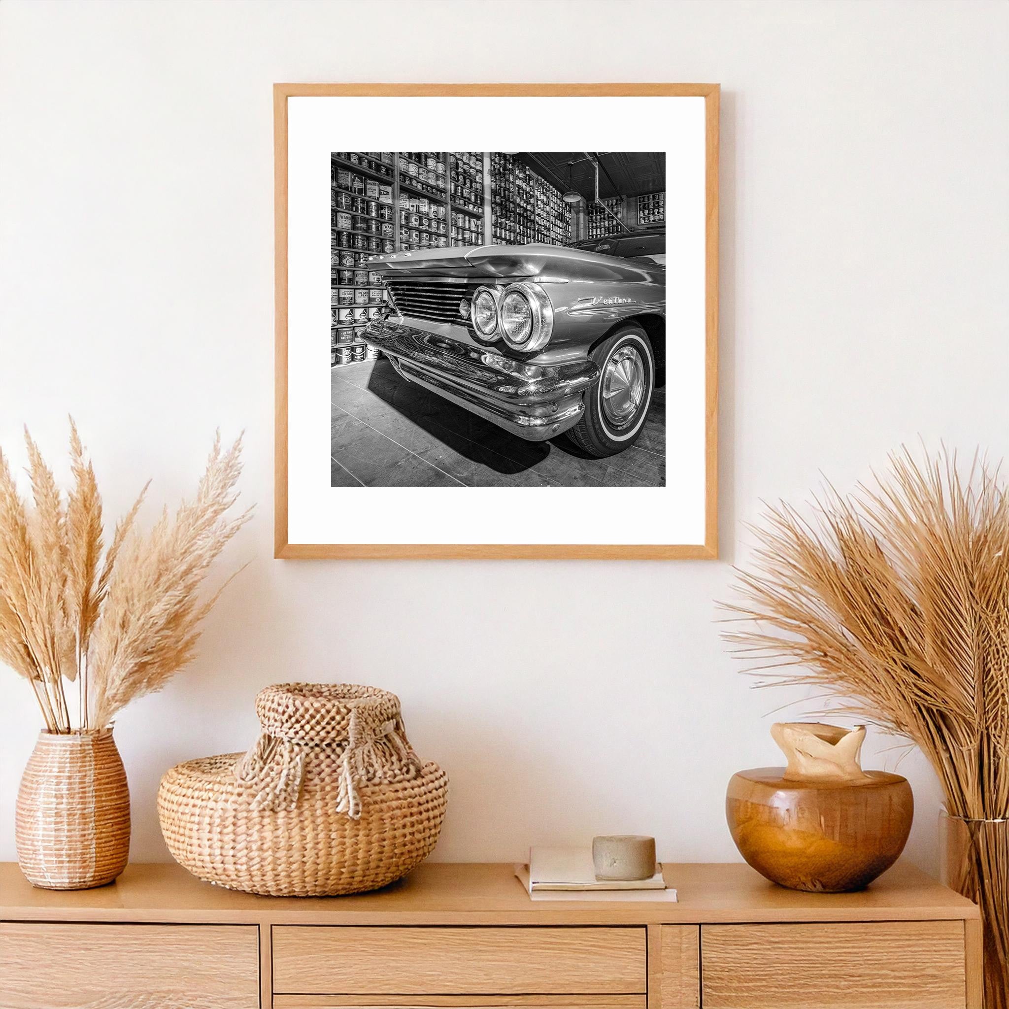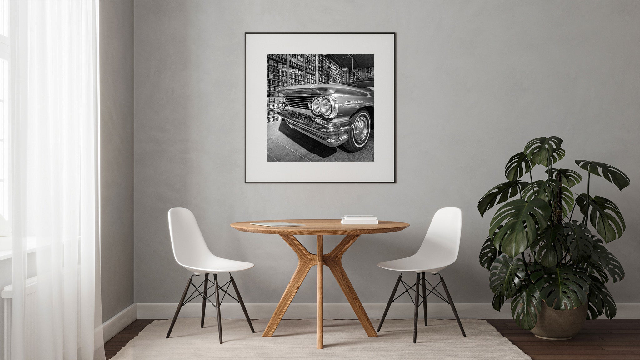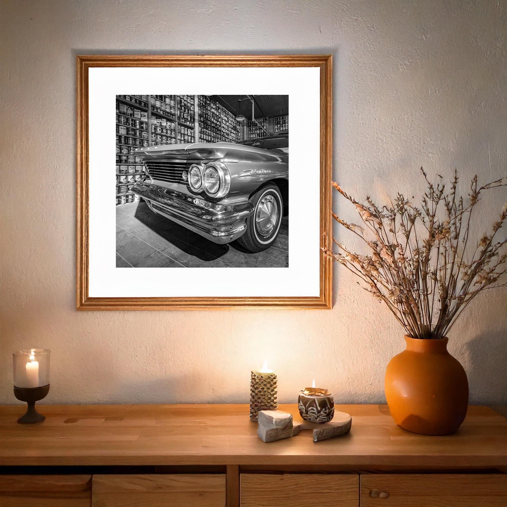 This piece fits naturally with anyone who appreciates classic automotive design, Americana, or the gritty, enduring charm of roadside history. It works well in offices, garages, living rooms, or anywhere that needs a touch of timeless character. And it’s one of those images that invites you to walk closer—there’s always another detail waiting in the shine of the chrome or in the typography on the wall of cans.
