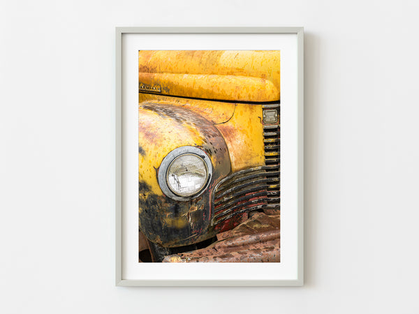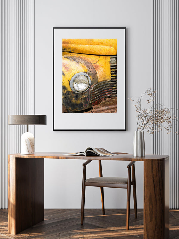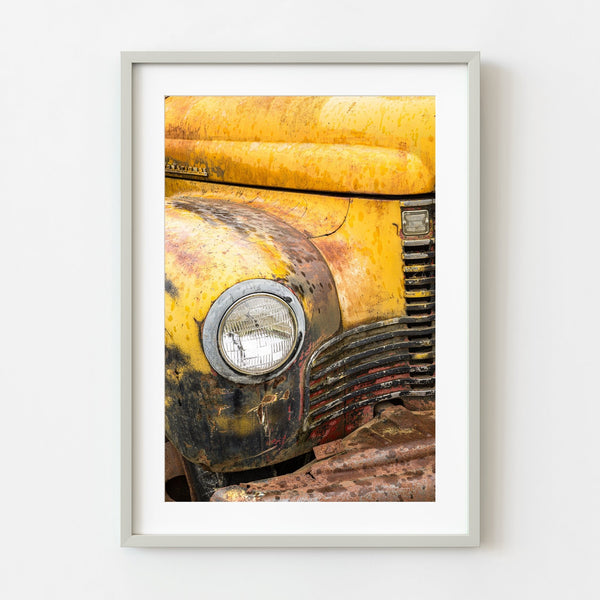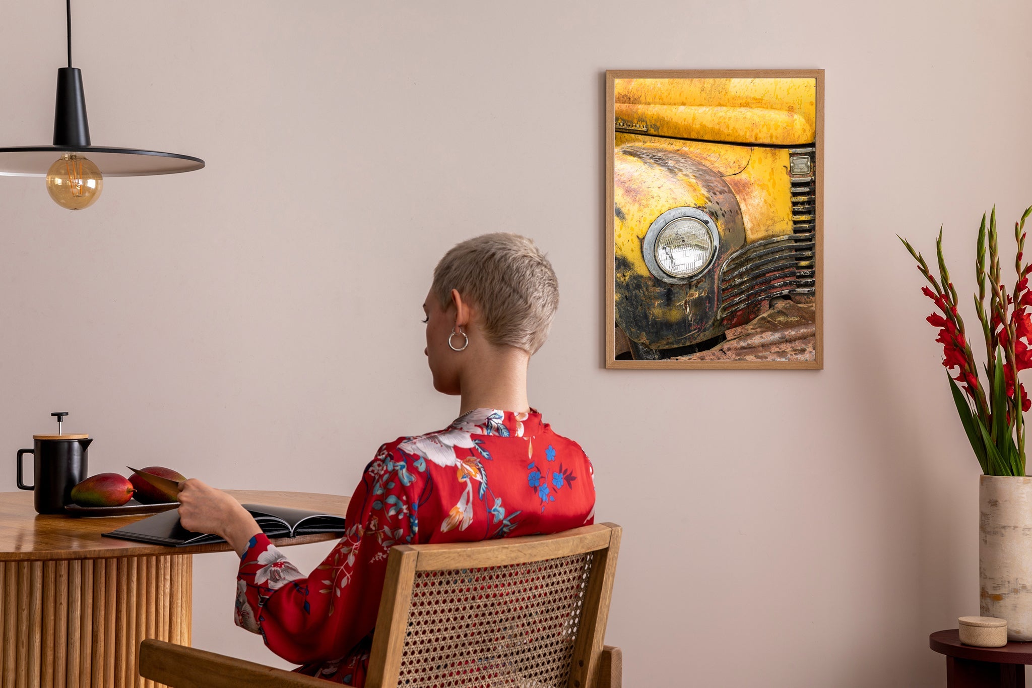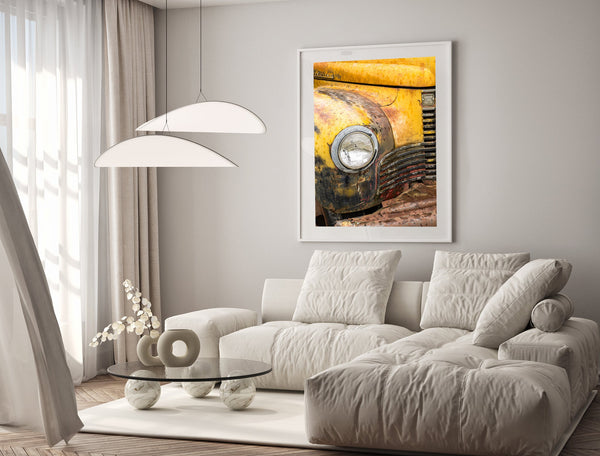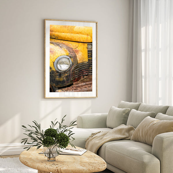 Up close, this truck tells you everything. Rust has claimed the edges, paint has peeled to a dull matte, and the headlight sits like an eye that’s seen its share of work. This wall art print focuses on one detail—the front corner of an old yellow truck—where corrosion and colour meet in quiet harmony.