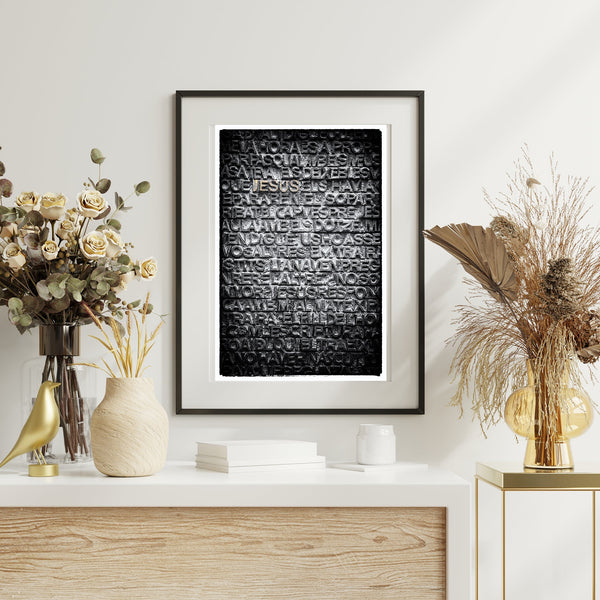 In the heart of Barcelona, the Basilica de la Sagrada Familia unfolded before my lens, showcasing a blend of architectural brilliance and religious symbolism. I was drawn towards a distinct feature, a word collage delicately etched in stone with 'Jesus' as its centerpiece. This photograph embodies the spiritual essence and meticulous design that pervades this historic basilica, offering a physical manifestation of faith amidst the grandeur of Antoni Gaudí's vision.