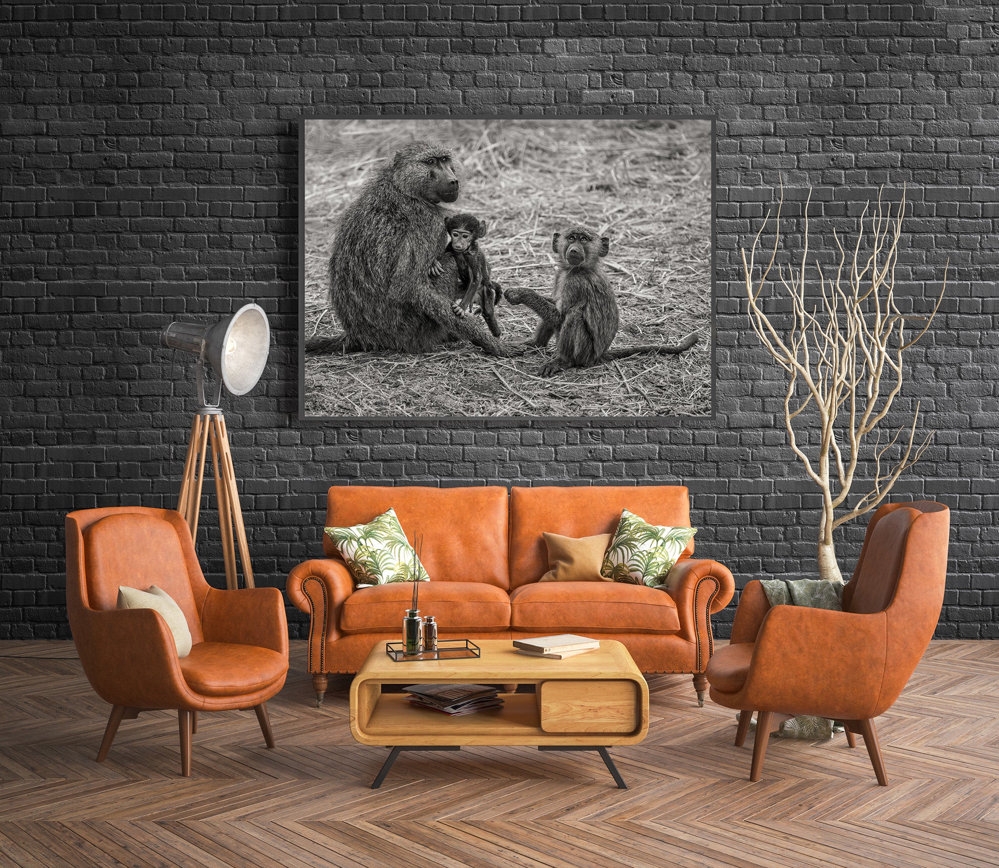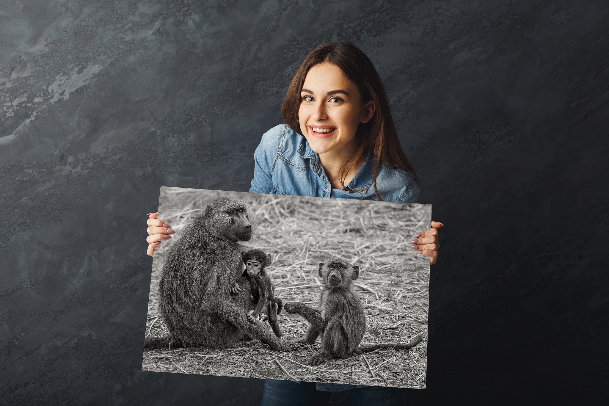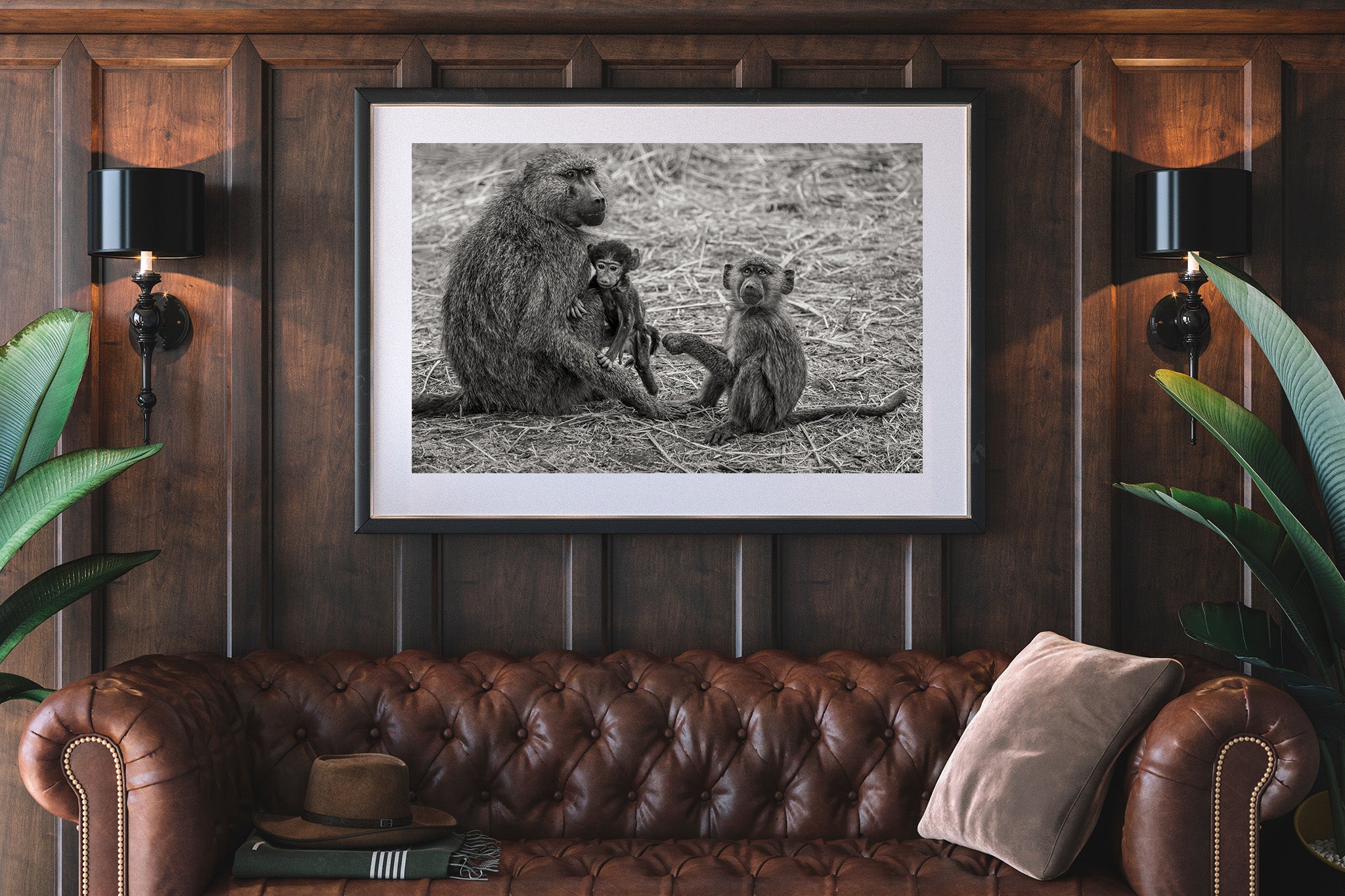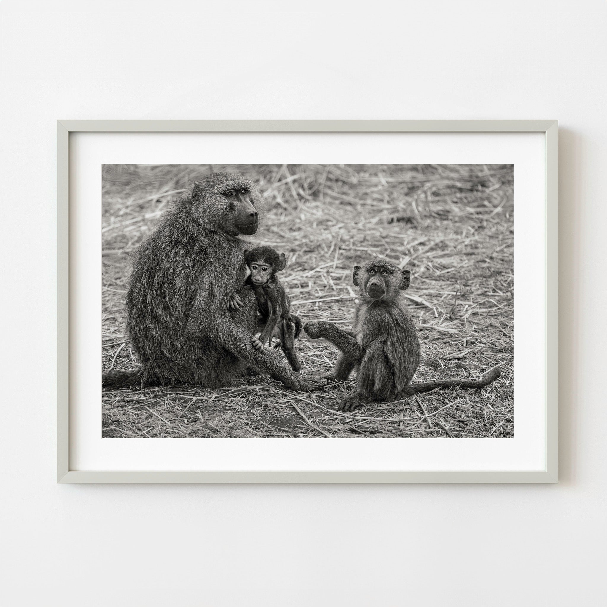 坦桑尼亚塞伦盖蒂狒狒母亲和婴儿家庭单色